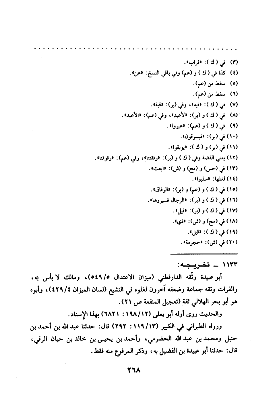 ورواه الطبراني في الكبير (13/ 119: 292) قال: حدثنا عبد الله بن أحمد بن حنبل ومحمد بن عبد الله الحضرمي، وأحمد بن يحيي بن خالد بن حيان الرقي، قال: حدثنا أبو عبيدة بن الفضيل به، وذكر المرفوع منه فقط.=