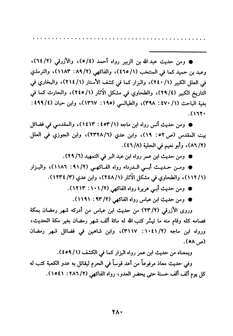 = • ومن حديث عبد الله بن الزبير رواه أحمد (4/ 5)، والأزرقي (2/ 64)، وعبد بن حميد كما في المنتخب (1/ 465)، والفاكهي (2/ 89: 1183)، والترمذي في العلل الكبير (1/ 240)، والبزار كما في كشف الأستار (1/ 214)، والبخاري في التاريخ الكبير (4/ 29)، والطحاوي في مشكل الآثار (1/ 245)، والحارث كما في بغية الباحث (1/ 470: 398)، والطيالسي (195: 1367)، وابن حبان (4/ 499: 1620)