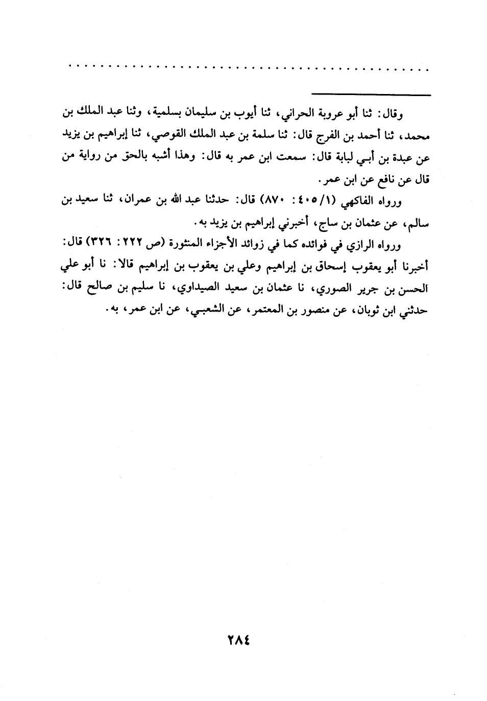 = وقال: ثنا أبو عروبة الحراني، ثنا أيوب بن سليمان بسلمية، وثنا عبد الملك بن محمَّد، ثنا أحمد بن الفرج قال: ثنا سلمة بن عبد الملك القوسي، ثنا إبراهيم بن يزيد عن عبدة بن أبي لبابة قال: سمعت ابن عمر به قال: وهذا أشبه بالحق من رواية من قال عن نافع عن ابن عمر.
