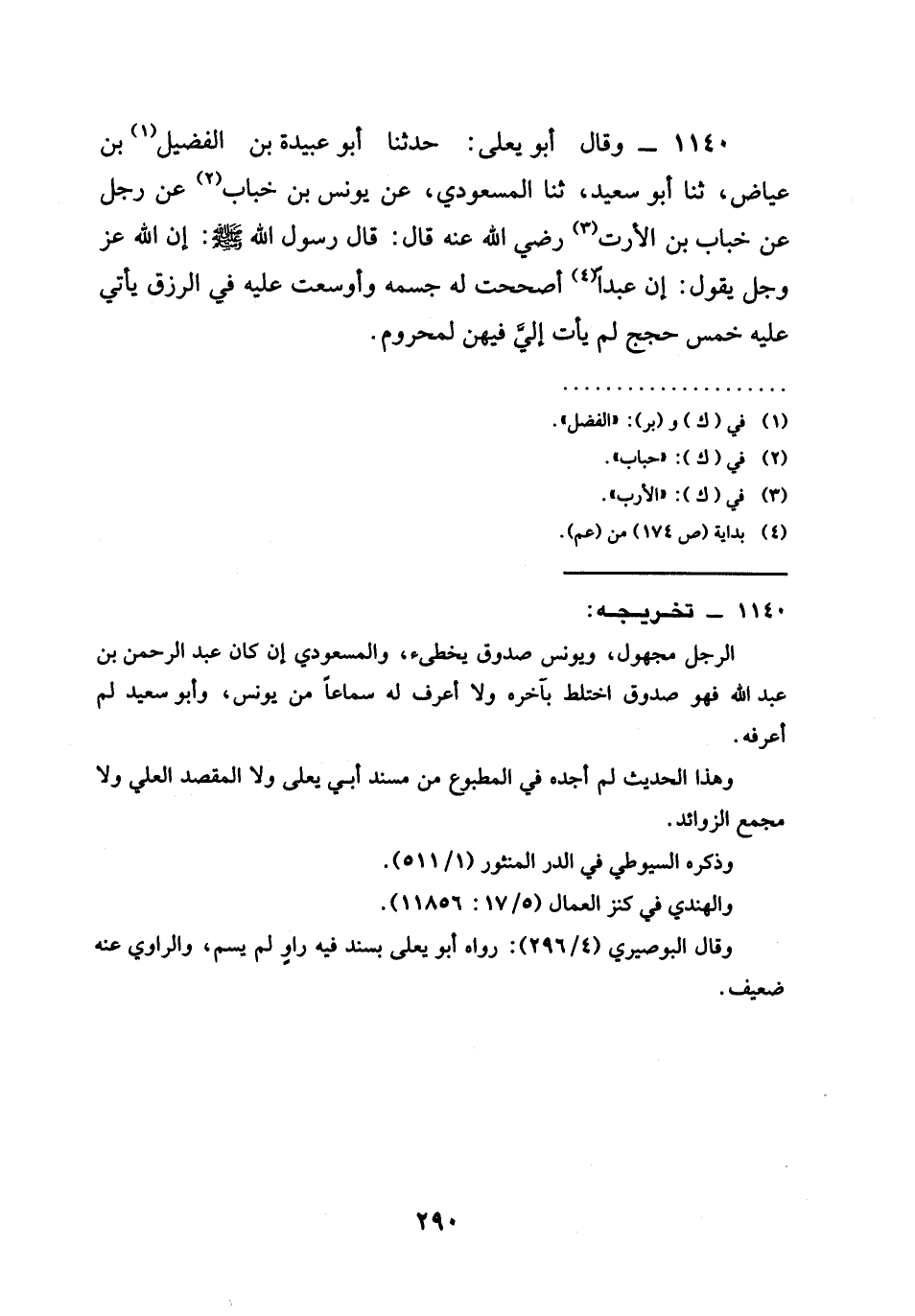 1140 - وَقَالَ أَبُو يَعْلَى حَدَّثَنَا أَبُو عُبَيْدَةَ بْنُ الفضيل بْنِ عِيَاضٍ ثنا أَبُو سَعِيدٍ ثنا الْمَسْعُودِيُّ عَنْ يُونُسَ بْنِ خَبَّابٍ عَنْ رَجُلٍ عَنْ خَبَّابِ بن الأرت رَضِيَ الله عَنْه قَالَ قَالَ رَسُولُ اللَّهِ صَلَّى اللَّهُ عَلَيْهِ وَسَلَّمَ إِنَّ اللَّهَ عَزَّ وَجَلَّ يَقُولُ §إِنَّ عَبْدًا أَصْحَحْتُ لَهُ جِسْمَهُ وَأَوْسَعْتُ عَلَيْهِ فِي الرِّزْقِ يَأْتِي عَلَيْهِ خَمْسُ حِجَجٍ لَمْ يَأْتِ إِلَيَّ فِيهِنَّ لَمَحْرُومٌ