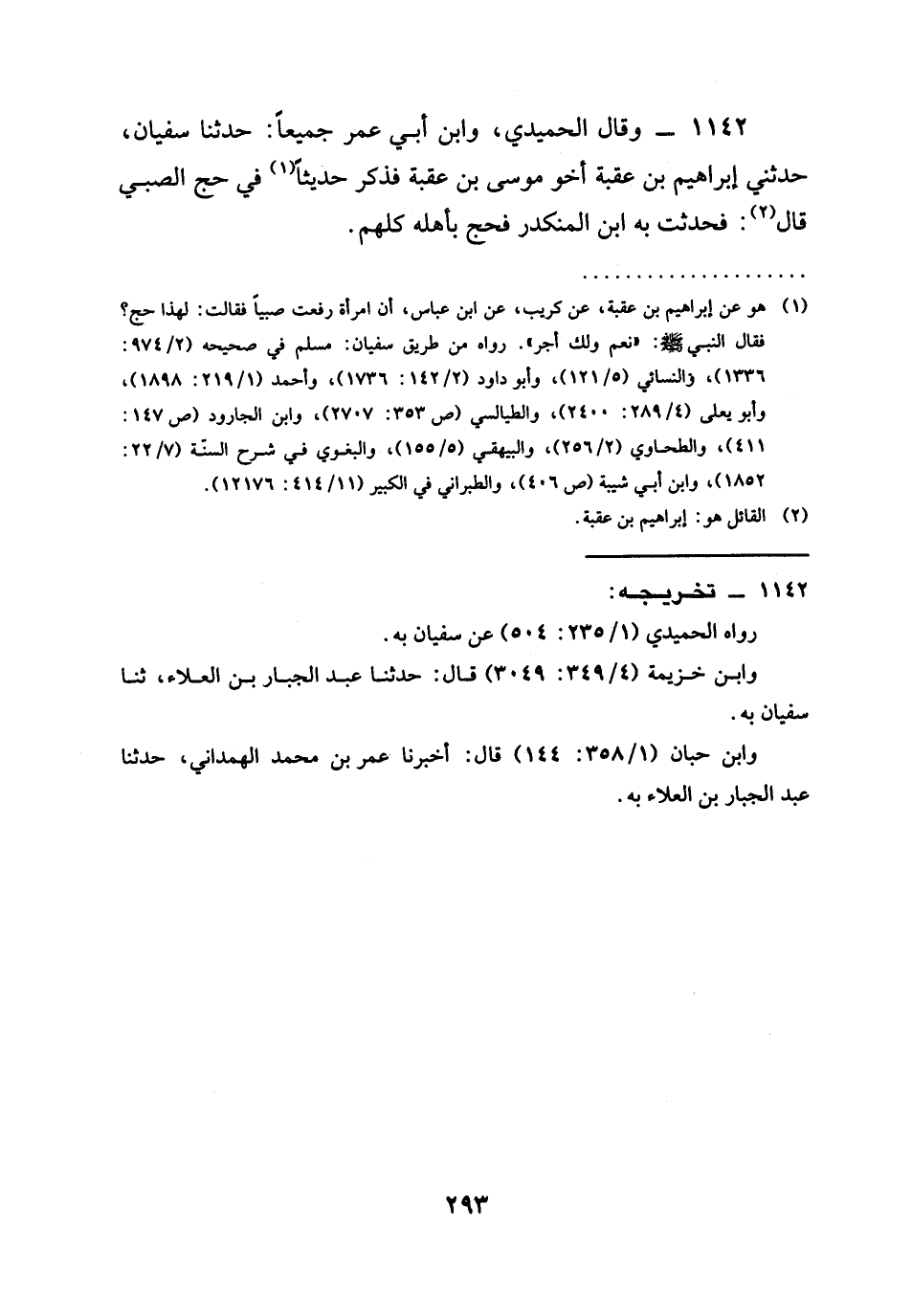 1142 - وَقَالَ الْحُمَيْدِيُّ، وَابْنُ أَبِي عُمَرَ جَمِيعًا: حَدَّثَنَا سُفْيَانُ، حَدَّثَنِي إِبْرَاهِيمُ بْنُ عُقْبَةَ أَخُو مُوسَى بن عقبة فذكر حديثًا (¬1) فِي حَجِّ الصَّبِيِّ قَالَ (¬2): فَحَدَّثْتُ بِهِ ابْنَ المنكدر فحج بأهله كلهم.