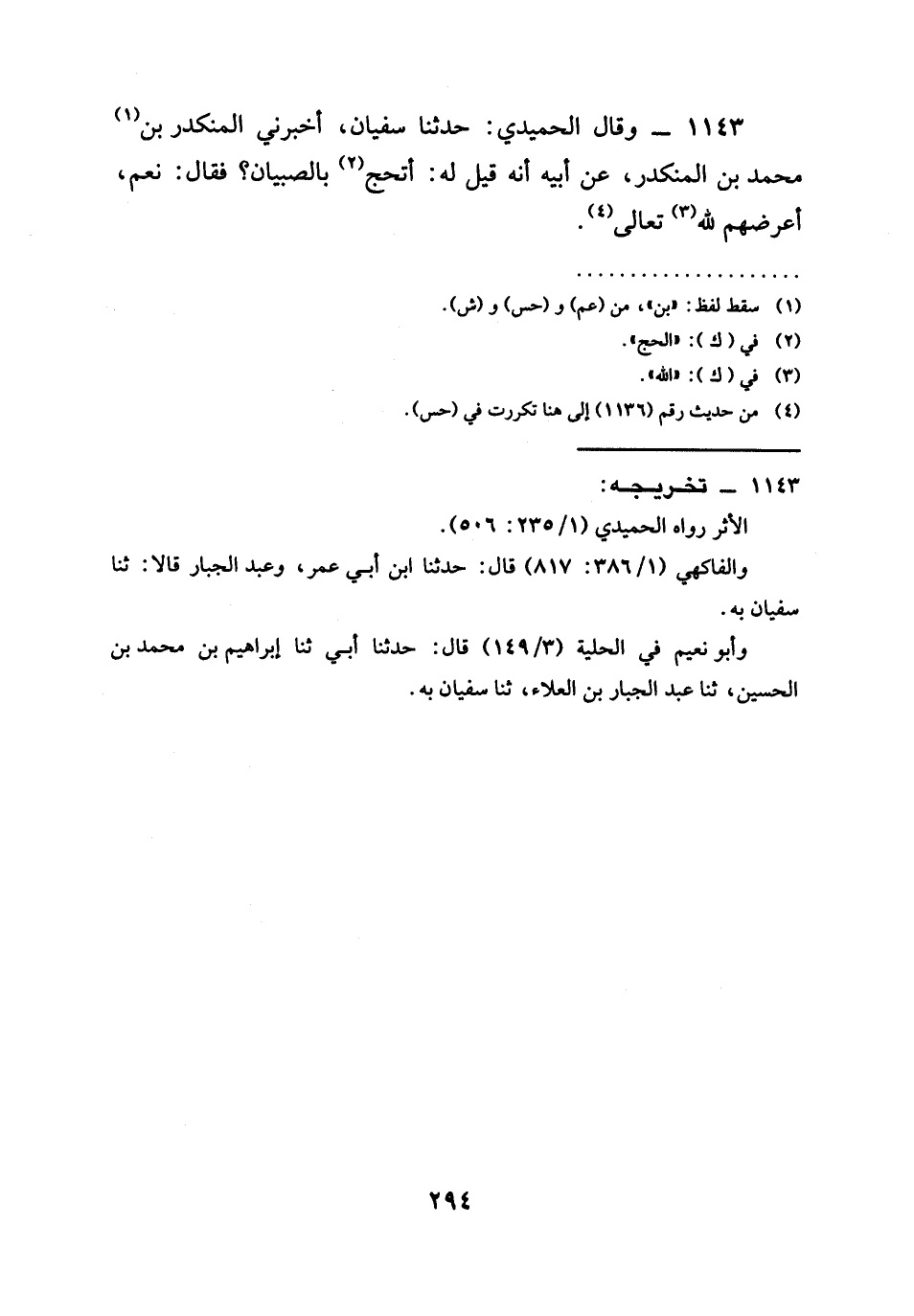 1143 - وَقَالَ الْحُمَيْدِيُّ حَدَّثَنَا سُفْيَانُ أَخْبَرَنِي الْمُنْكَدِرُ بْنُ مُحَمَّدِ بْنِ الْمُنْكَدِرِ عَنْ أَبِيهِ أَنَّهُ قِيلَ لَهُ §أَتَحُجُّ بِالصِّبْيَانِ فَقَالَ نَعَمْ أَعْرِضُهُمْ لِلَّهِ تَعَالَى