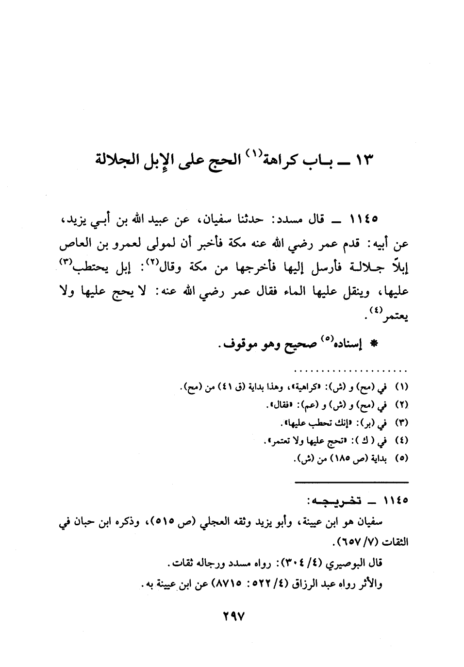 1145 - قَالَ مُسَدَّدٌ حَدَّثَنَا سُفْيَانُ عَنْ عُبَيْدِ اللَّهِ بْنِ أَبِي يَزِيدَ عَنْ أَبِيهِ قدم عمر رَضِيَ الله عَنْه مَكَّةَ فَأُخْبِرَ أَنَّ لِمَوْلًى لِعَمْرِو بْنِ الْعَاصِ إِبِلًا جَلَّالَةً فَأَرْسَلَ إِلَيْهَا فَأَخْرَجَهَا مِنْ مَكَّةَ وَقَالَ إِبِلٌ يَحْتَطِبُ عَلَيْهَا وَيَنْقُلُ عَلَيْهَا الْمَاءَ فقال عمر رَضِيَ الله عَنْه §لَا يحج عَلَيْهَا وَلَا يعتمر
