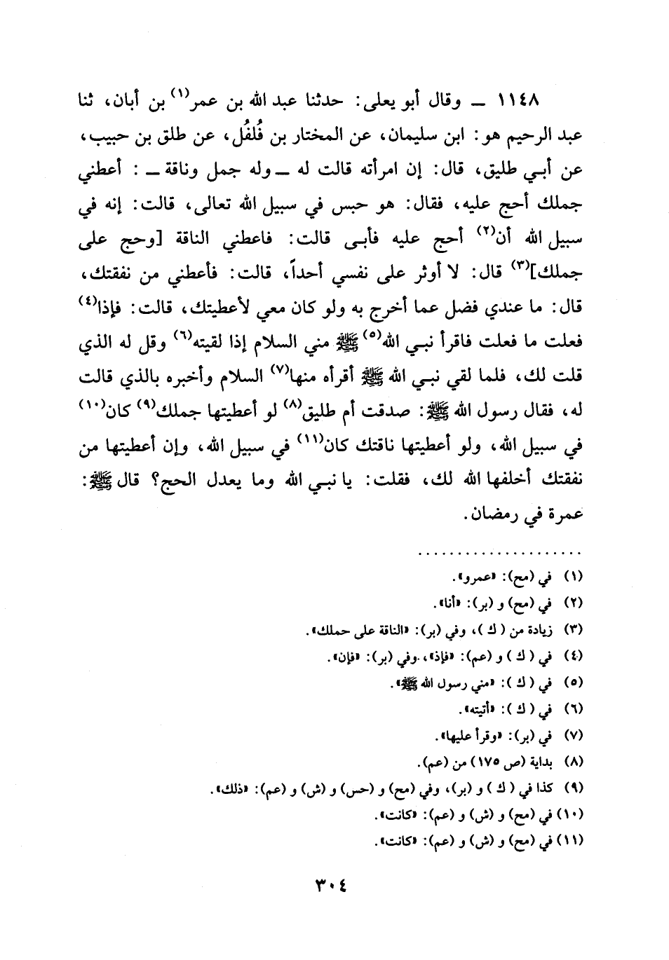 1148 - وَقَالَ أَبُو يَعْلَى حَدَّثَنَا عَبْدُ اللَّهِ بْنُ عُمَرَ بْنِ أَبَانَ ثنا عَبْدُ الرَّحِيمِ هُوَ ابْنُ سُلَيْمَانَ عَنِ الْمُخْتَارِ بْنِ فُلْفُلٍ عَنْ طَلْقِ بْنِ حَبِيبٍ عَنْ أبي طليق قال أَنَّ امْرَأَتَهَ قَالَتْ لَهُ وَلَهُ جَمَلٌ وَنَاقَةٌ أَعْطِنِي جَمَلَكَ أَحُجُّ عَلَيْهِ فَقَالَ هُوَ حَبْسٌ فِي سبيل الله تعالى قالت إِنَّهُ فِي سَبِيلِ اللَّهِ إِنْ أَحُجَّ عليه فأبى قالت فَأَعْطِنِي النَّاقَةَ وَحُجَّ عَلَى جَمَلِكَ قَالَ لَا أُوثِرُ عَلَى نَفْسِي أَحَدًا قَالَتْ فَأَعْطِنِي مِنْ نَفَقَتِكَ قَالَ مَا عِنْدِي فَضْلٌ عَمَّا أَخْرُجُ بِهِ وَلَوْ كَانَ مَعِي لَأَعْطَيْتُكِ قَالَتْ فَإِذَا فَعَلْتَ مَا فَعَلْتَ فاقرأ نَبِيَّ اللَّهِ صَلَّى اللَّهُ عَلَيْهِ وَسَلَّمَ مِنِّي السَّلَامَ إِذَا لقيته وَقُلْ لَهُ الَّذِي قُلْتُ لَكَ فلما لقي نبي الله صَلَّى اللَّهُ عَلَيْهِ وَسَلَّمَ أَقْرَأَهُ مِنْهَا السَّلَامَ وَأَخْبَرَهُ بِالَّذِي قَالَتْ لَهُ فَقَالَ رَسُولُ اللَّهِ صَلَّى اللَّهُ عَلَيْهِ وَسَلَّمَ §صَدَقَتْ أُمُّ طَلِيقٍ لَوْ أَعْطَيْتَهَا جَمَلَكَ كَانَ فِي سَبِيلِ اللَّهِ وَلَوْ أعطيتها ناقتك كان فِي سَبِيلِ اللَّهِ وَإِنْ أَعْطَيْتَهَا مِنْ نَفَقَتِكَ أَخْلَفَهَا اللَّهُ لَكَ فَقُلْتُ يَا نَبِيَّ اللَّهِ وَمَا يَعْدِلُ الْحَجَّ قَالَ صَلَّى اللَّهُ عَلَيْهِ وَسَلَّمَ عَمْرَةٌ فِي رَمَضَانَ