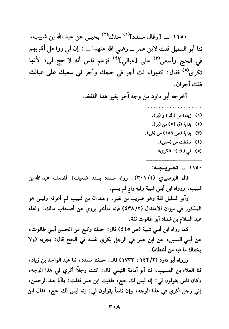 1150 - وَقَالَ مُسَدَّدٌ حَدَّثَنَا يَحْيَى عَنْ عَبْدِ اللَّهِ بْنِ شَبِيبٍ ثنا أَبُو السَّلِيلِ قُلْتُ لابن عمر رَضِيَ الله عَنْهما إِنَّ لِي رَوَاحِلُ أْكَرِيهُمْ فِي الْحَجِّ وأسعى عَلَى عِيَالِي فَزَعَمَ نَاسٌ أَنَّهُ لَا حَجَّ لِي لِأَنَّهَا تُكْرَى فَقَالَ كَذَبُوا §لَكَ أَجْرٌ فِي حَجِّكَ وَأَجْرٌ فِي سَعْيِكَ عَلَى عِيَالِكَ فَلَكَ أَجْرَانِ أَخْرَجَهُ أَبُو دَاوُدَ مِنْ وَجْهٍ آخَرَ بِغَيْرِ هَذَا اللَّفْظِ