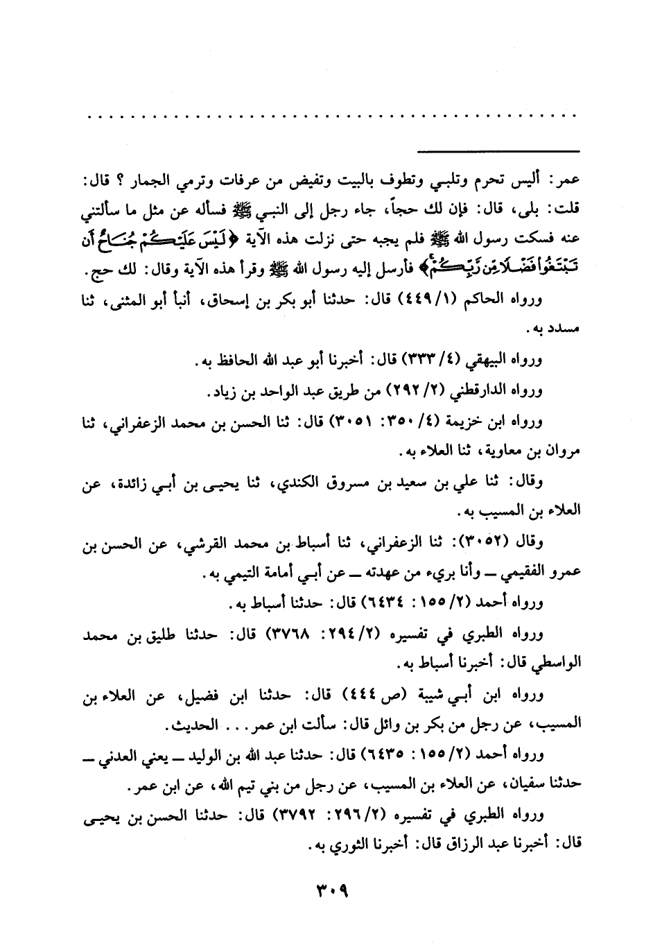 = عمر: أليس تحرم وتلبي وتطوف بالبيت وتفيض من عرفات وترمي الجمار؟ قال: قلت: بلى، قال: فإن لك حجًا، جَاءَ رَجُلٌ إِلَى النَّبِيِّ -صَلَّى اللَّهُ عَلَيْهِ وسلم- فسأله عن مثل ما سألتني عنه فَسَكَتَ رَسُولِ اللَّهِ -صَلَّى اللَّهُ عَلَيْهِ وَسَلَّمَ- فَلَمْ يجبه حتى نزلت هذه الآية {لَيْسَ عَلَيْكُمْ جُنَاحٌ أَنْ تَبْتَغُوا فَضْلًا مِنْ رَبِّكُمْ} فَأَرْسَلَ إِلَيْهِ رَسُولُ اللَّهِ -صَلَّى اللَّهُ عَلَيْهِ وَسَلَّمَ- وقرأ هذه الآية وقال: لك حج.
