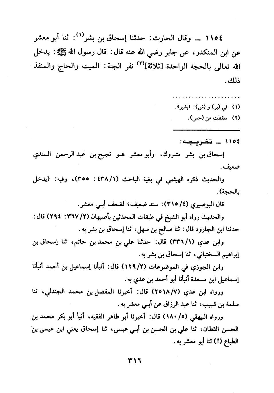 1154 - وَقَالَ الْحَارِثُ حَدَّثَنَا إِسْحَاقُ بْنُ بِشْرٍ ثنا أَبُو مَعْشَرٍ عَنِ ابْنِ الْمُنْكَدِرِ عن جابر رَضِيَ الله عَنْه قَالَ قَالَ رَسُولُ اللَّهِ صَلَّى اللَّهُ عَلَيْهِ وَسَلَّمَ §يدخل الله تعالى بِالْحُجَّةِ الْوَاحِدَةِ ثَلَاثَةَ نَفَرٍ الْجَنَّةَ الْمَيِّتَ وَالْحَاجَّ وَالْمُنْفِذَ ذَلِكَ -[318]-