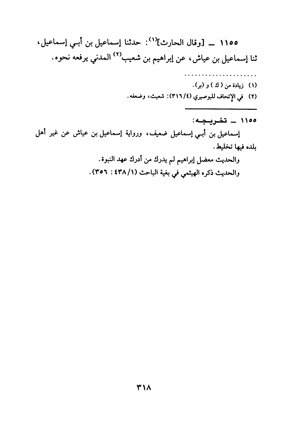 1155 - [وَقَالَ الْحَارِثُ] (¬1): حَدَّثَنَا إِسْمَاعِيلُ بْنُ أَبِي إِسْمَاعِيلَ، ثنا إِسْمَاعِيلُ بْنُ عَيَّاشٍ، عَنْ إِبْرَاهِيمَ بْنِ شعيب (¬2) المدني يرفعه نحوه.