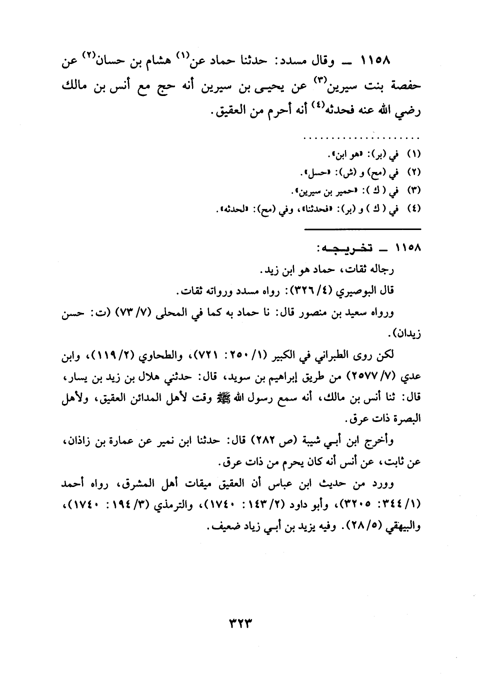 1158 - وَقَالَ مُسَدَّدٌ حَدَّثَنَا حَمَّادٌ عَنْ هِشَامِ بْنِ حَسَّانَ عَنْ حَفْصَةَ بِنْتِ سِيرِينَ عَنْ يَحْيَى بْنِ سِيرِينَ أَنَّهُ حَجَّ مَعَ أَنَسِ بن مالك رَضِيَ الله عَنْه فحدثه أَنَّهُ §أَحْرَمَ مِنَ الْعَقِيقِ