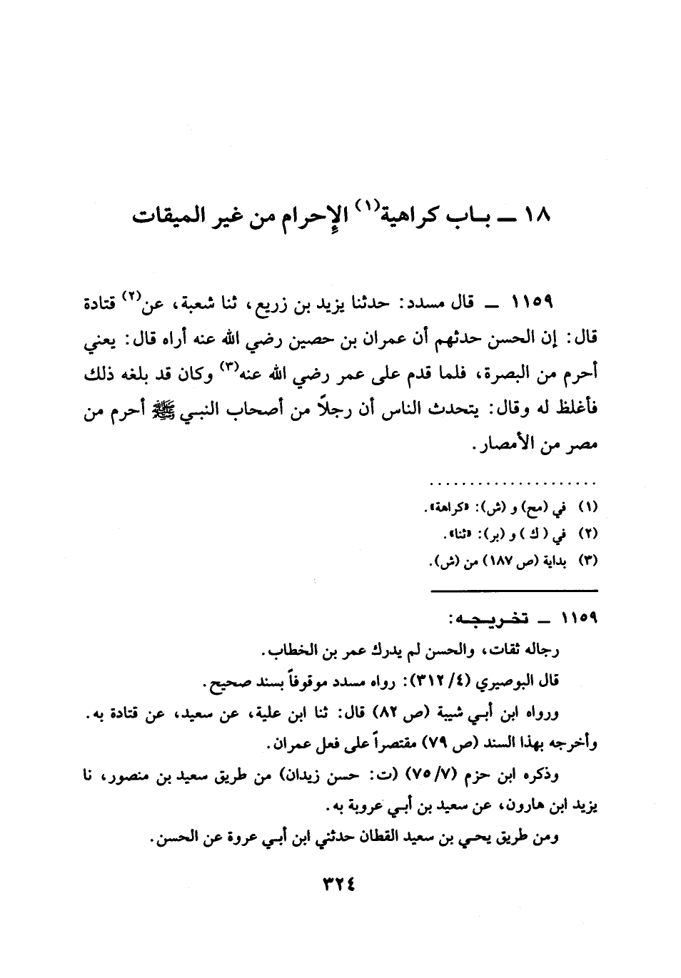 1159 - قَالَ مُسَدَّدٌ حَدَّثَنَا يَزِيدُ بْنُ زُرَيْعٍ ثنا شعبة عن قتادة قال أَنَّ الْحَسَنَ حَدَّثَهُمْ أَنَّ عِمْرَانَ بن حصين رَضِيَ الله عَنْه أُرَاهُ قَالَ يَعْنِي أَحْرَمَ مِنَ الْبَصْرَةِ فَلَمَّا قَدِمَ على عمر رَضِيَ الله عَنْه وَكَانَ قَدْ بَلَغَهُ ذَلِكَ فَأَغْلَظَ لَهُ وَقَالَ §يَتَحَدَّثُ النَّاسُ أَنَّ رَجُلًا من أصحاب أالنَّبِيِّ صَلَّى اللَّهُ عَلَيْهِ وَسَلَّمَ أَحْرَمَ مِنْ مِصْرٍ مِنَ الْأَمْصَارِ