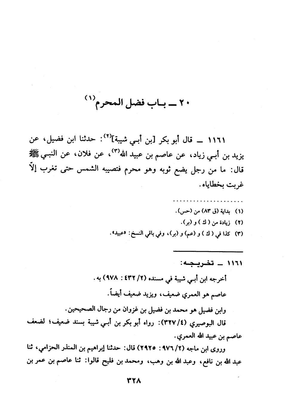 116 - قَالَ أَبُو بَكْرِ بْنُ أَبِي شَيْبَةَ حَدَّثَنَا ابْنُ فُضَيْلٍ عَنْ يَزِيدَ بْنِ أَبِي زِيَادٍ عَنْ عَاصِمِ بْنِ عُبَيْدِ اللَّهِ عَنْ فُلَانٍ عَنِ النَّبِيِّ صَلَّى اللَّهُ عَلَيْهِ وَسَلَّمَ قَالَ §مَا مِنْ رَجُلٍ يَضَعُ ثَوْبَهُ وَهُوَ مُحْرِمٌ فَتُصِيبُهُ الشَّمْسُ حَتَّى تَغْرُبَ إِلَّا غَرُبَتْ بخطاياه
