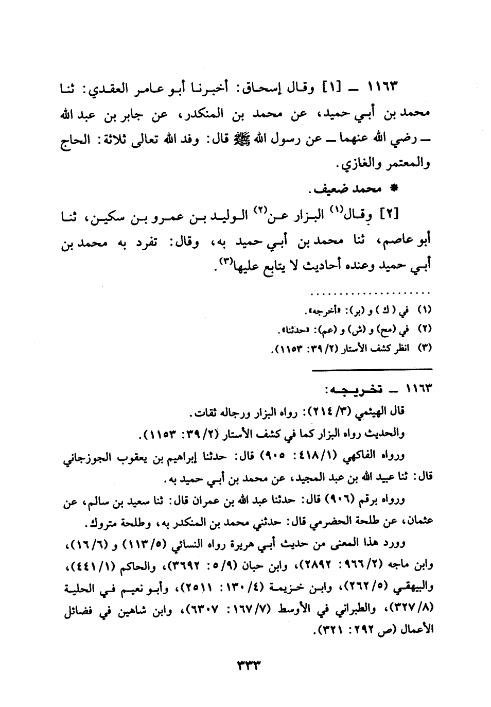 1163 -[1] وَقَالَ إِسْحَاقُ أَخْبَرَنَا أَبُو عَامِرٍ الْعَقَدِيُّ ثنا مُحَمَّدُ بْنُ أَبِي حُمَيْدٍ عَنْ مُحَمَّدِ بْنِ الْمُنْكَدِرِ عَنْ جَابِرِ بْنِ عبد الله رَضِيَ الله عَنْهما عَنْ رسول الله صَلَّى اللَّهُ عَلَيْهِ وَسَلَّمَ قال §وفد الله تعالى ثَلَاثَةٌ الْحَاجُّ وَالْمُعْتَمِرُ وَالْغَازِي