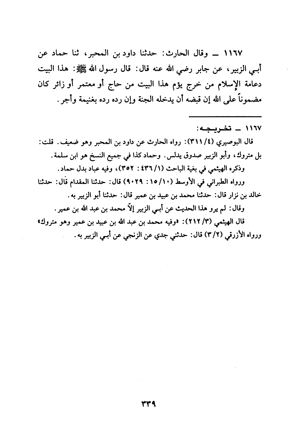 1167 - وَقَالَ الْحَارِثُ حَدَّثَنَا دَاوُدُ بْنُ الْمُحَبَّرِ ثنا حَمَّادٌ عَنْ أَبِي الزُّبَيْرِ عن جابر رَضِيَ الله عَنْه قَالَ قَالَ رَسُولُ اللَّهِ صَلَّى اللَّهُ عَلَيْهِ وَسَلَّمَ §هَذَا الْبَيْتُ دِعَامَةُ الْإِسْلَامِ مَنْ خَرَجَ يَؤُمُّ هَذَا الْبَيْتَ مِنْ حَاجٍّ أَوْ مُعْتَمِرٍ أَوْ زَائِرٍ كَانَ مَضْمُونًا عَلَى اللَّهِ إِنْ قَبَضَهُ أَنْ يُدْخِلَهُ الْجَنَّةَ وَإِنْ رَدَّهُ رَدَّهُ بِغَنِيمَةٍ وَأَجْرٍ