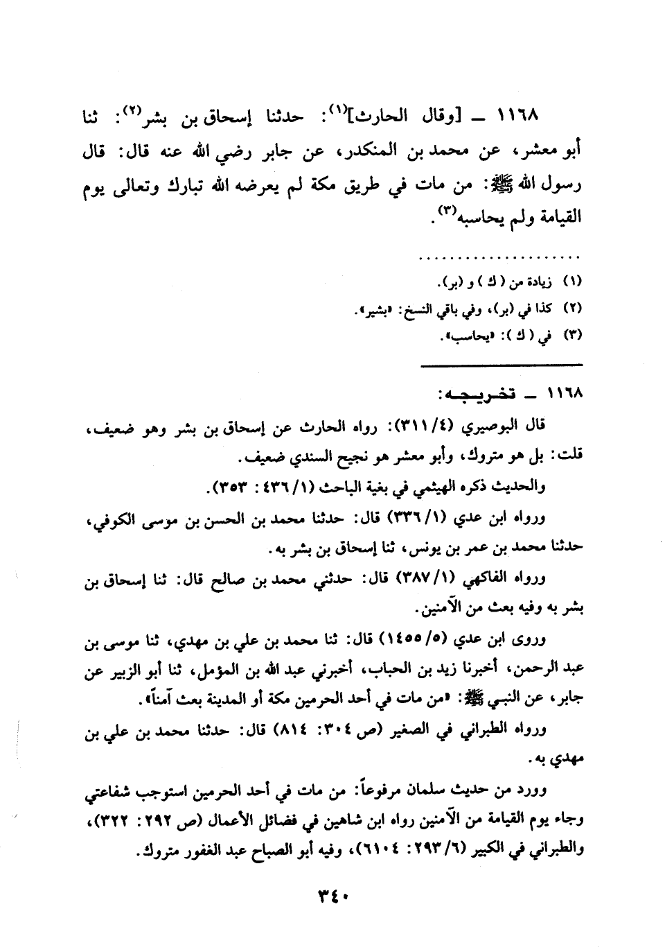 1168 - وَقَالَ الْحَارِثُ حَدَّثَنَا إسحاق بن بشر ثنا أَبُو مَعْشَرٍ عَنْ مُحَمَّدِ بْنِ الْمُنْكَدِرِ عن جابر رَضِيَ الله عَنْه قَالَ قَالَ رَسُولُ اللَّهِ صَلَّى اللَّهُ عَلَيْهِ وَسَلَّمَ §مَنْ مَاتَ فِي طَرِيقِ مَكَّةَ لَمْ يعرضه الله تبارك وتعالى يَوْمَ الْقِيَامَةِ وَلَمْ يُحَاسِبْهُ