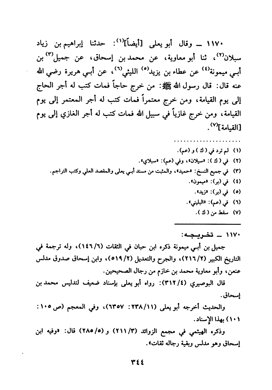 1170 - وَقَالَ أبو يعلى أيضا حَدَّثَنَا إِبْرَاهِيمُ بْنُ زِيَادٍ سَبَلَانُ ثنا أَبُو مُعَاوِيَةَ عَنْ مُحَمَّدِ بْنِ إسحاق عن جميل بْنِ أَبِي مَيْمُونَةَ عَنْ عَطَاءِ بْنِ يَزِيدَ اللَّيْثِيِّ عَنْ أبي هريرة رَضِيَ الله عَنْه قَالَ قَالَ رَسُولُ اللَّهِ صَلَّى اللَّهُ عَلَيْهِ وَسَلَّمَ §مَنْ خَرَجَ حَاجًّا فَمَاتَ كُتِبَ لَهُ أَجْرُ الْحَاجِّ إِلَى يَوْمِ الْقِيَامَةِ وَمَنْ خَرَجَ مُعْتَمِرًا فَمَاتَ كُتِبَ لَهُ أَجْرُ الْمُعْتَمِرِ إِلَى يَوْمِ الْقِيَامَةِ وَمَنْ خَرَجَ غَازِيًا في سبيل الله فَمَاتَ كُتِبَ لَهُ أَجْرُ الْغَازِي إِلَى يَوْمِ الْقِيَامَةِ