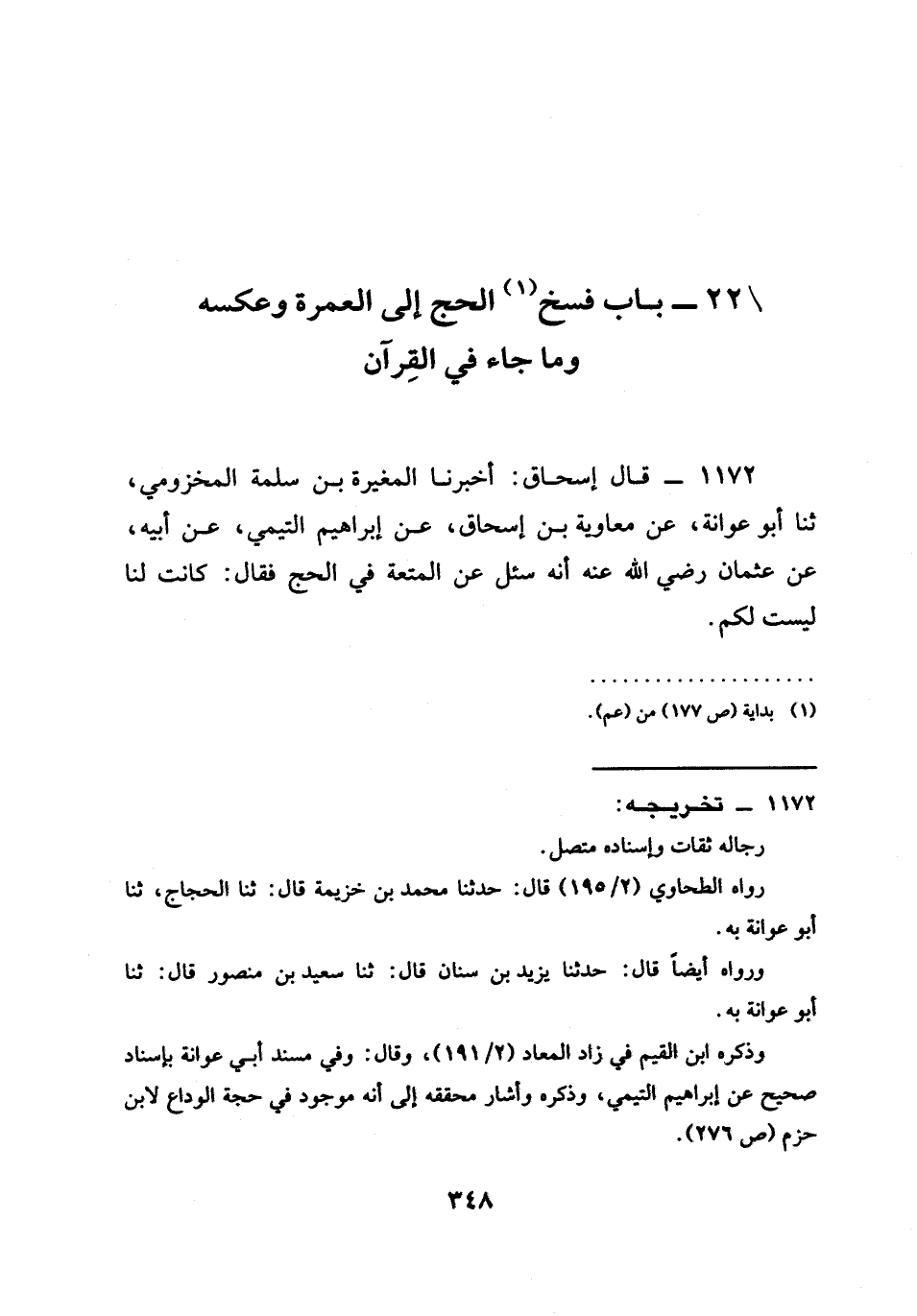 1172 - قَالَ إِسْحَاقُ أَخْبَرَنَا الْمُغِيرَةُ بْنُ سَلَمَةَ الْمَخْزُومِيُّ ثنا أَبُو عَوَانَةَ عَنْ مُعَاوِيَةَ بْنِ إِسْحَاقَ عَنْ إِبْرَاهِيمَ التَّيْمِيِّ عَنْ أَبِيهِ عن عثمان رَضِيَ الله عَنْه أَنَّهُ سُئِلَ عَنِ §المتعة فِي الْحَجِّ فَقَالَ كَانَتْ لَنَا لَيْسَتْ لَكُمْ