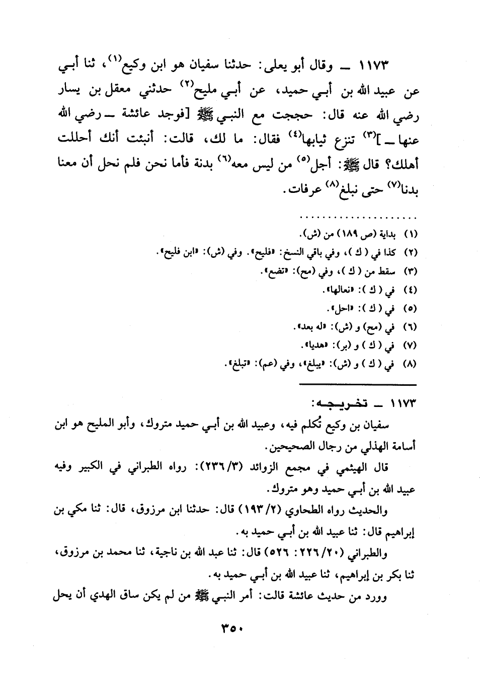 1173 - وَقَالَ أَبُو يَعْلَى حَدَّثَنَا سُفْيَانُ هُوَ ابْنُ وَكِيعٍ ثنا أَبِي عَنْ عُبَيْدِ اللَّهِ بْنِ أَبِي حُمَيْدٍ عن أبي مليح حَدَّثَنِي مَعْقِلُ بن يسار رَضِيَ الله عَنْه قَالَ حَجَجْتُ مع النبي صَلَّى اللَّهُ عَلَيْهِ وَسَلَّمَ فوجد عائشة رَضِيَ الله عَنْها تنزع ثيابها فَقَالَ مَا لَكِ قَالَتْ أُنْبِئْتُ أَنَّكَ أَحْلَلْتَ أهلك قال صَلَّى اللَّهُ عَلَيْهِ وَسَلَّمَ §أجل مَنْ لَيْسَ مَعَهُ بَدَنَةٌ فأما نحن فلم نَحِلُّ أن معنا بدنا حَتَّى نَبْلُغَ عَرَفَاتٍ