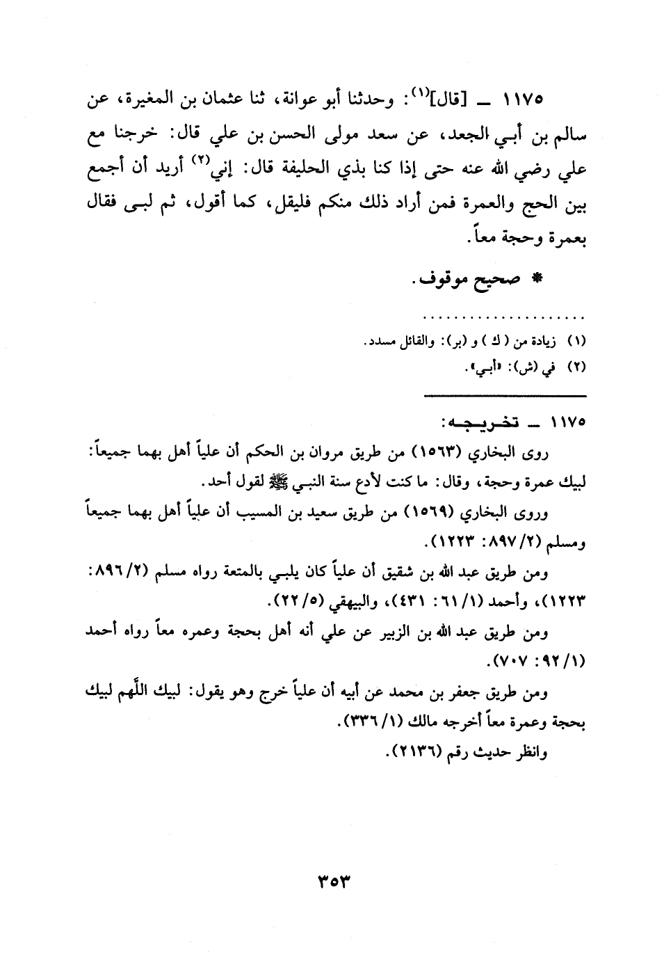 1175 - قَالَ وَحَدَّثَنَا أَبُو عَوَانَةَ ثنا عُثْمَانُ بْنُ الْمُغِيرَةِ عَنْ سَالِمِ بْنِ أَبِي الْجَعْدِ عَنْ سَعْدٍ مَوْلَى الْحَسَنِ بْنِ عَلِيٍّ قَالَ خَرَجْنَا مع علي رَضِيَ الله عَنْه حَتَّى إِذَا كُنَّا بِذِي الحليفة قَالَ إني §أريد أن أجمع بَيْنَ الْحَجِّ وَالْعُمْرَةِ فَمَنْ أَرَادَ ذَلِكَ مِنْكُمْ فَلْيَقُلْ كَمَا أَقُولُ ثُمَّ لَبَّى فَقَالَ بِعُمْرَةٍ وَحَجَّةٍ مَعًا