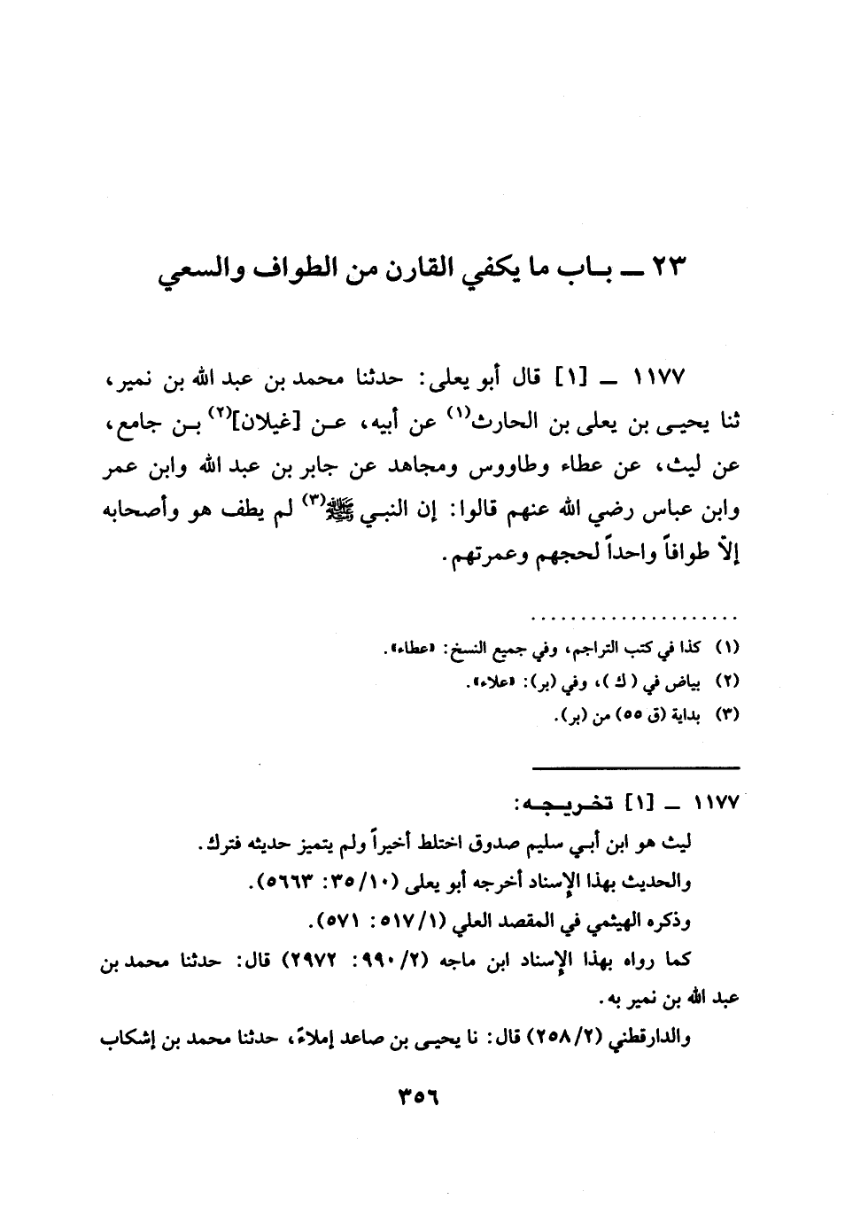 1177 -[1] قَالَ أَبُو يَعْلَى حَدَّثَنَا مُحَمَّدُ بْنُ عَبْدِ اللَّهِ بْنِ نُمَيْرٍ ثنا يَحْيَى بْنُ يعلى بن الحارث عَنْ أَبِيهِ عَنْ غَيْلَانَ بْنِ جَامِعٍ عَنْ لَيْثٍ عَنْ عَطَاءٍ وطاووس وَمُجَاهِدٍ عَنْ جَابِرِ بْنِ عَبْدِ اللَّهِ وَابْنِ عُمَرَ وابن عباس رَضِيَ الله عَنْهم قالوا أَنَّ §النَّبِيَّ صَلَّى اللَّهُ عَلَيْهِ وَسَلَّمَ لَمْ يَطُفْ هُوَ وَأَصْحَابُهُ إِلَّا طَوَافًا وَاحِدًا لحجتهم وَعُمْرَتِهِمْ -[358]-