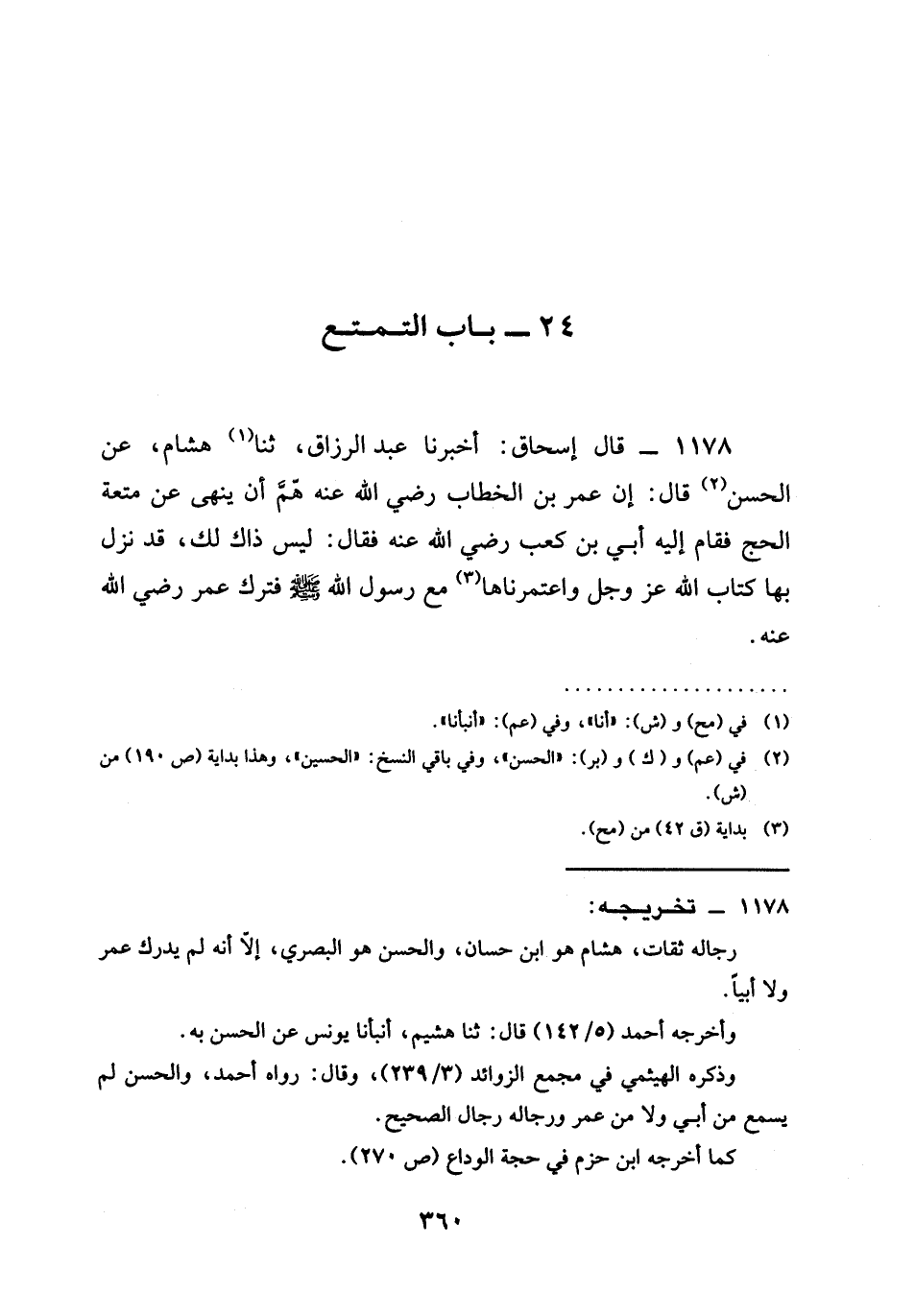 1178 - قَالَ إِسْحَاقُ أَخْبَرَنَا عَبْدُ الرَّزَّاقِ ثنا هِشَامٌ عن الحسن قال أَنَّ عُمَرَ بن الخطاب رَضِيَ الله عَنْه هَمَّ أَنْ يَنْهَى عَنْ مُتْعَةِ الْحَجِّ فَقَامَ إِلَيْهِ أُبَيُّ بن كعب رَضِيَ الله عَنْه فَقَالَ لَيْسَ ذَاكَ لَكَ قَدْ §نَزَلَ بِهَا كتاب الله عز وجل وَاعْتَمَرْنَاهَا مَعَ رَسُولِ اللَّهِ صَلَّى اللَّهُ عَلَيْهِ وَسَلَّمَ فَتَرَكَ عُمَرُ رَضِيَ الله عَنْه
