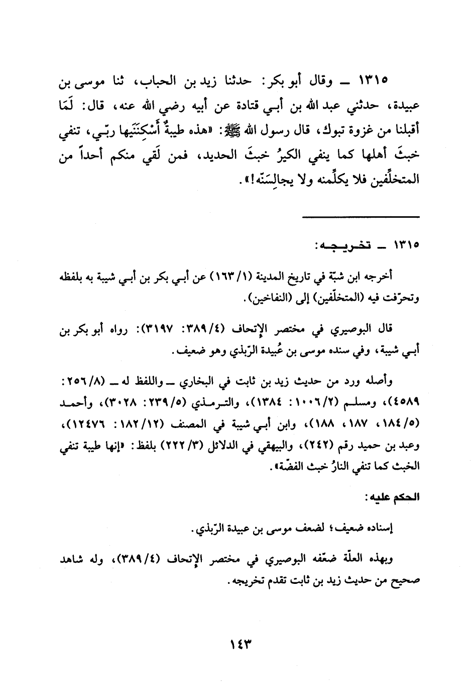 1315 - وَقَالَ أَبُو بَكْرِ حَدَّثَنَا زَيْدُ بْنُ الْحُبَابِ ثنا مُوسَى بْنُ عُبَيْدَةَ حَدَّثَنِي عَبْدُ اللَّهِ بْنُ أَبِي قَتَادَةَ عن أبيه رَضِيَ الله عَنْه قَالَ لَمَّا أَقْبَلْنَا مِنْ غَزْوَةِ تَبُوكٍ قَالَ رَسُولُ اللَّهِ صَلَّى اللَّهُ عَلَيْهِ وَسَلَّمَ §هَذِهِ طَيْبَةٌ أَسْكَنَنِيهَا رَبِّي تَنْفِي خَبَثَ أَهْلِهَا كَمَا يَنْفِي الْكِيرُ خَبَثَ الْحَدِيدِ فَمَنْ لَقِيَ مِنْكُمْ أَحَدًا مِنَ الْمُتَخَلِّفِينَ فَلَا يُكَلِّمْنَّهُ وَلَا يُجَالِسَنَّهُ