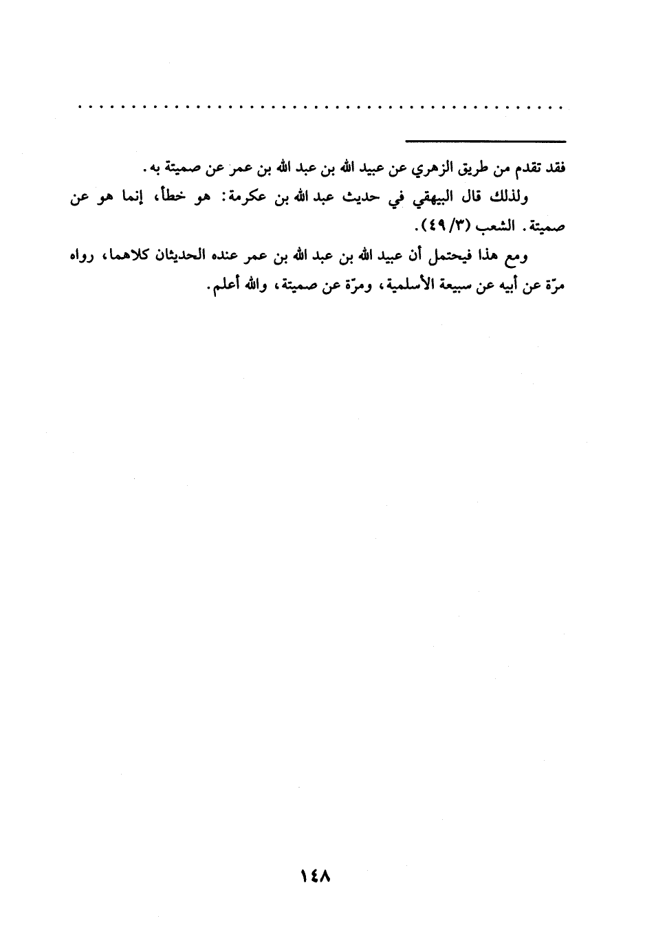 ومع هذا فيحتمل أن عبيد الله بن عبد الله بن عمر عنده الحديثان كلاهما، رواه مرة عن أبيه عن سبيعة الأسلمية، ومرّة عن صميتة، والله أعلم.
