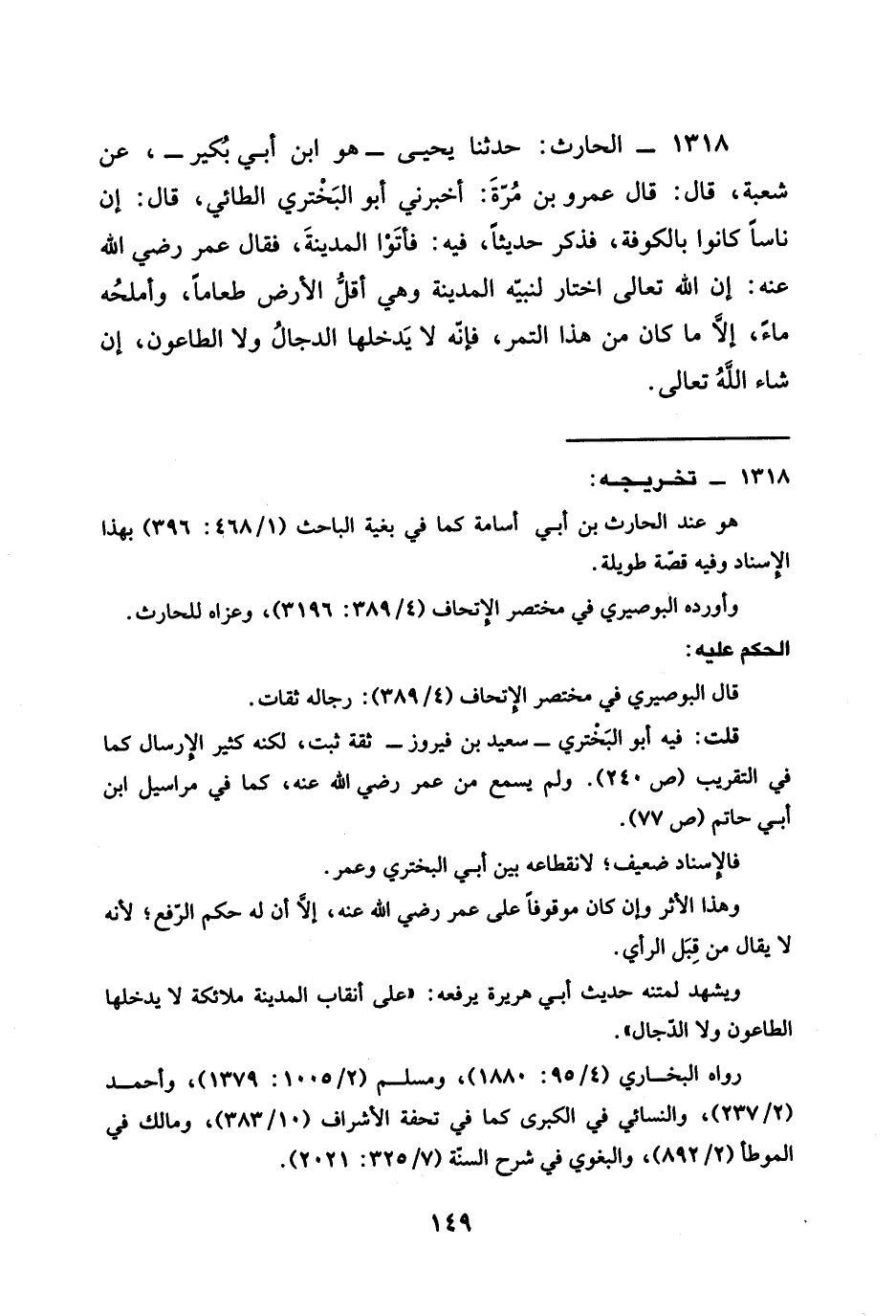 1318 - الْحَارِثُ حدثنا يَحْيَى هُوَ ابْنُ أَبِي بُكَيْرٍ عَنْ شُعْبَةَ قَالَ قَالَ عَمْرُو بْنُ مُرَّةَ أَخْبَرَنِي أَبُو البختري الطائي قال أَنَّ نَاسًا كَانُوا بِالْكُوفَةِ فَذَكَرَ حَدِيثًا فِيهِ فَأَتَوُا الْمَدِينَةَ فقال عمر رَضِيَ الله عَنْه إن §الله تعالى اخْتَارَ لِنَبِيِّهِ الْمَدِينَةَ وَهِيَ أَقَلُّ الْأَرْضِ طَعَامًا وَأَمْلَحُهُ مَاءً إِلَّا مَا كَانَ مِنْ هَذَا التَّمْرِ فَإِنَّهُ لَا يدخلها الدجال ولا الطاعون إِنْ شَاءَ اللَّهُ تَعَالَى