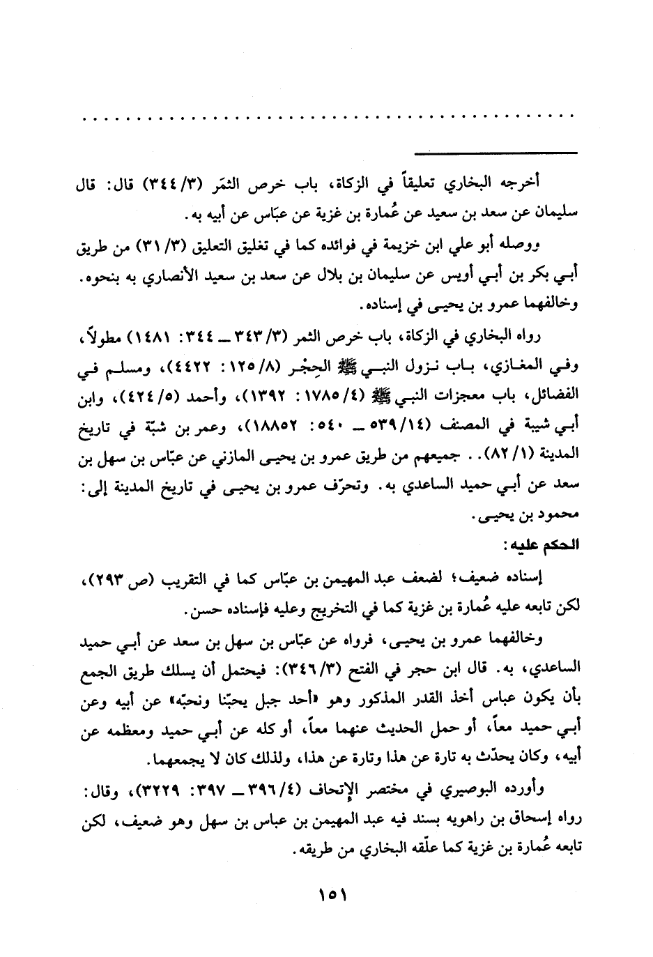 رواه البخاري في الزكاة، باب خرص الثمر (3/ 343 - 344: 1481) مطولًا، وفي المغازي، باب نزول النبي -صلى الله عليه وسلم- الحِجْر (8/ 125: 4422)، ومسلم في الفضائل، باب معجزات النبي -صلى الله عليه وسلم- (4/ 1785: 1392)، وأحمد (5/ 424)، وابن أبي شيبة في المصنف (14/ 539 - 540: 18852)، وعمر بن شبّة في تاريخ المدينة (1/ 82) .. جميعهم من طريق عمرو بن يحيى المازني عن عبّاس بن سهل بن سعد عن أبي حميد الساعدي به. وتحرّف عمرو بن يحيى في تاريخ المدينة إلى: محمود بن يحيى.