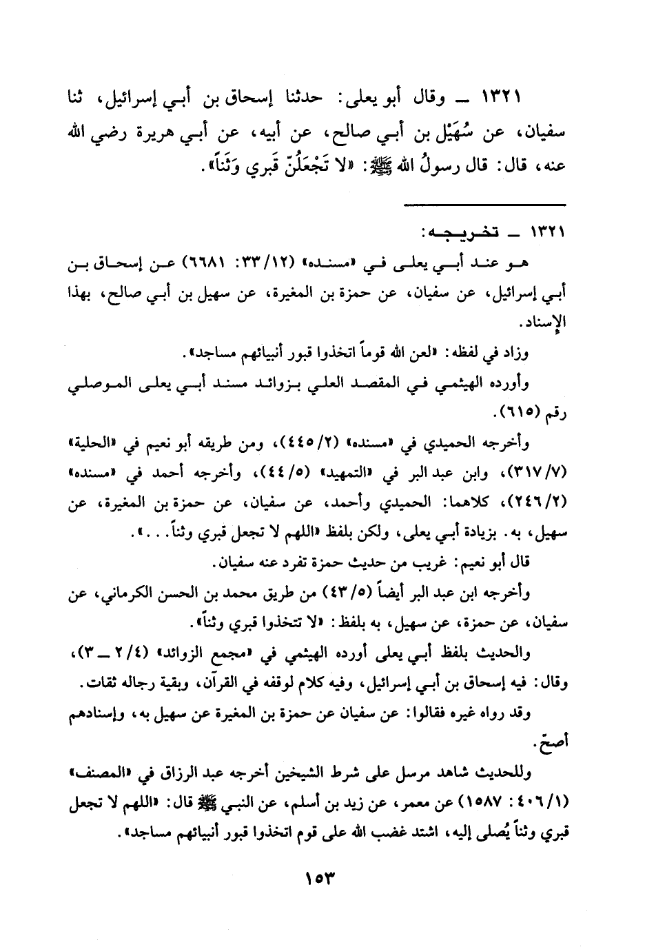 1321 - وقال أبو يعلى حدثنا إِسْحَاقُ بْنُ أَبِي إِسْرَائِيلَ ثنا سُفْيَانُ عَنْ سُهَيْلِ بْنِ أَبِي صالح عن أبيه عَنْ أبي هريرة رَضِيَ الله عَنْه قَالَ قَالَ رَسُولُ اللَّهِ صَلَّى اللَّهُ عَلَيْهِ وَسَلَّمَ §لَا تَجْعَلُنَّ قَبْرِي وَثَنًا