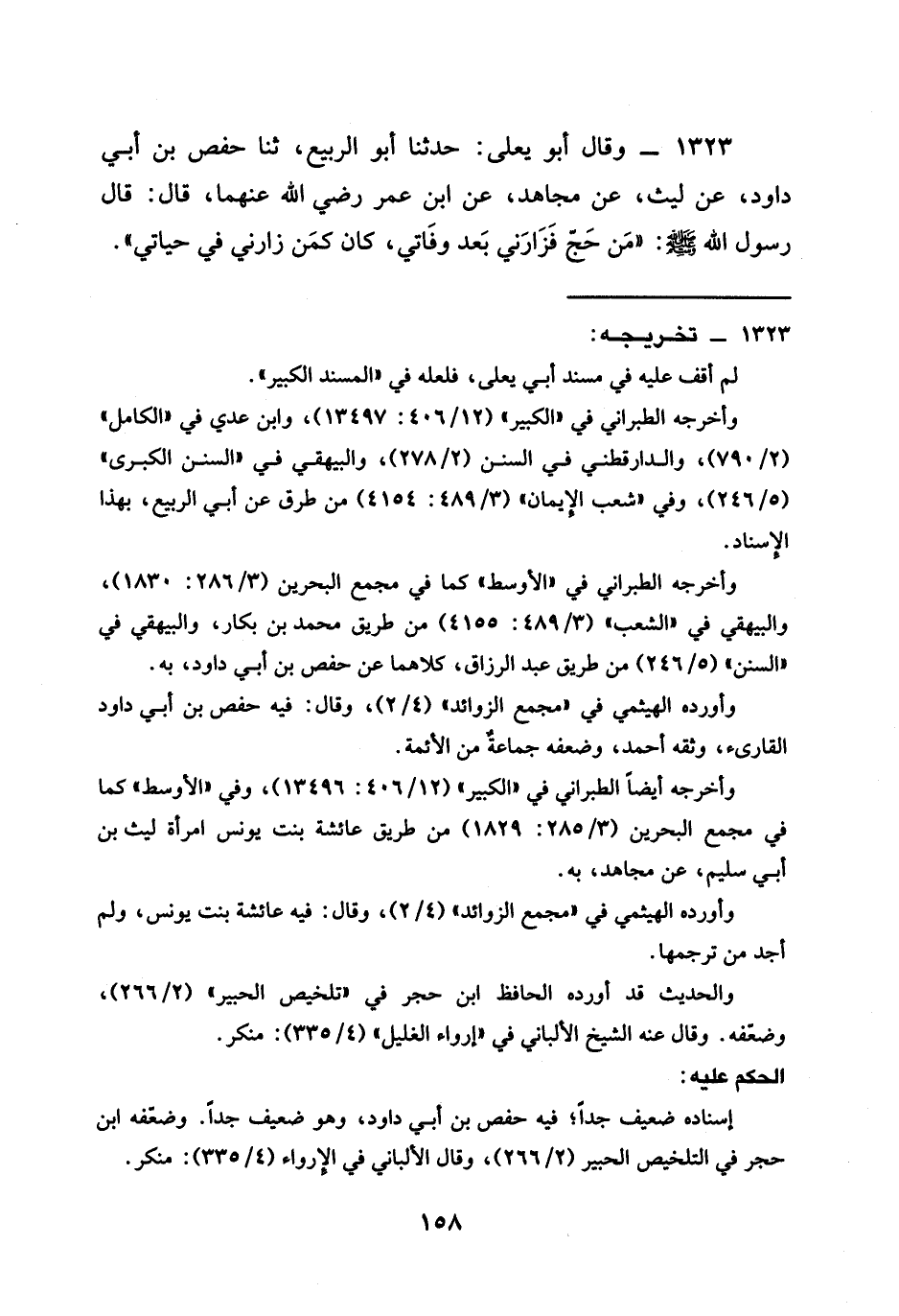 1323 - وَقَالَ أَبُو يعلى حدثنا أبو الرَّبِيعُ ثنا حَفْصُ بْنُ أَبِي دَاوُدَ عَنْ لَيْثٍ عَنْ مُجَاهِدٍ عَنِ ابن عمر رَضِيَ الله عَنْهما قَالَ قَالَ رَسُولُ اللَّهِ صَلَّى اللَّهُ عَلَيْهِ وَسَلَّمَ §مَنْ حَجَّ فَزَارَنِي بَعْدَ وَفَاتِي كَانَ كَمَنْ زَارَنِي فِي حَيَاتِي