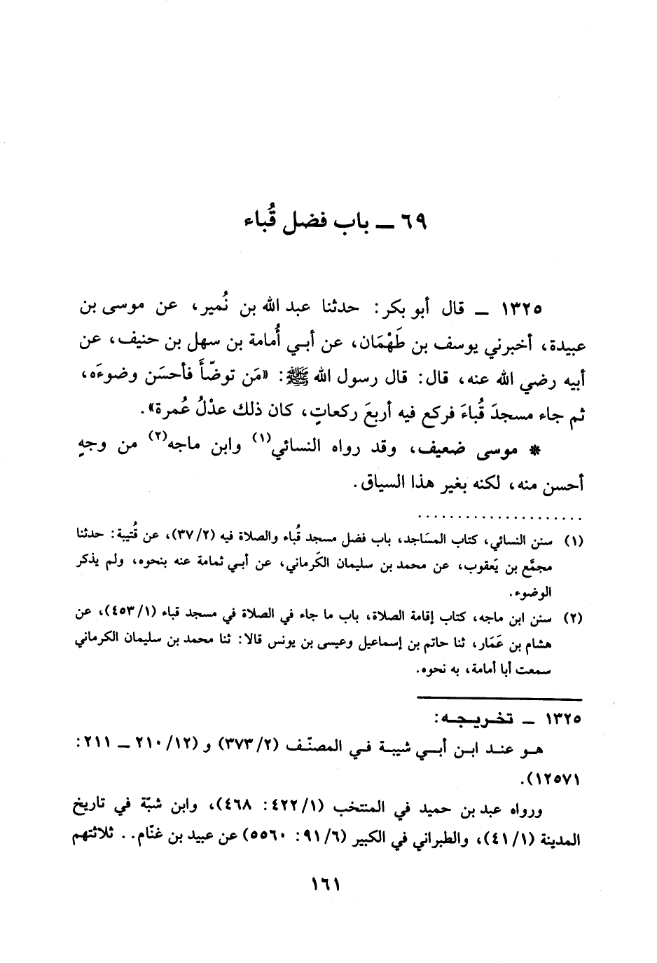 1325 - قَالَ أَبُو بَكْرٍ حَدَّثَنَا عَبْدُ اللَّهِ بْنُ نُمَيْرٍ عَنْ مُوسَى بْنِ عُبَيْدَةَ أَخْبَرَنِي يُوسُفُ بْنُ طَهْمَانَ عَنْ أَبِي إِمَامَةَ بْنِ سَهْلِ بْنِ حُنَيْفٍ عن أبيه رَضِيَ الله عَنْه قَالَ قَالَ رَسُولُ اللَّهِ صَلَّى اللَّهُ عَلَيْهِ وَسَلَّمَ §مَنْ تَوَضَّأَ فَأَحْسَنَ وُضُوءَهُ ثُمَّ جَاءَ مَسْجِدَ قُبَاءٍ فَرَكَعَ فِيهِ أَرْبَعَ رَكَعَاتٍ كَانَ ذَلِكَ عَدْلَ عُمْرَةٍ
