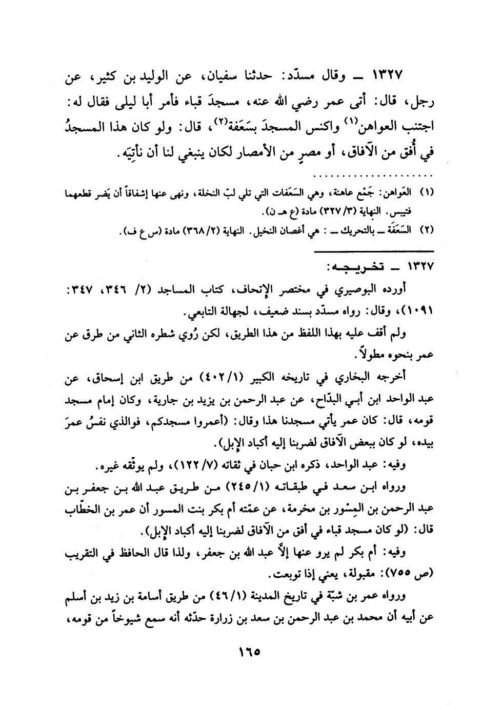 1327 - وَقَالَ مُسَدَّدٌ حَدَّثَنَا سُفْيَانُ عَنِ الْوَلِيدِ بْنِ كَثِيرٍ عَنْ رَجُلٍ قَالَ أتى عمر رَضِيَ الله عَنْه مَسْجِدَ قُبَاءٍ فَأَمَرَ أَبَا لَيْلَى فَقَالَ لَهُ §اجْتَنِبِ الْعَوَاهِنَ وَاكْنُسِ الْمَسْجِدَ بِسَعَفَةٍ قَالَ وَلَوْ كَانَ هَذَا الْمَسْجِدُ فِي أُفُقٍ مِنَ الْآفَاقِ أَوْ مِصْرٍ مِنَ الْأَمْصَارِ لَكَانَ يَنْبَغِي لَنَا أَنْ نَأْتِيَهُ