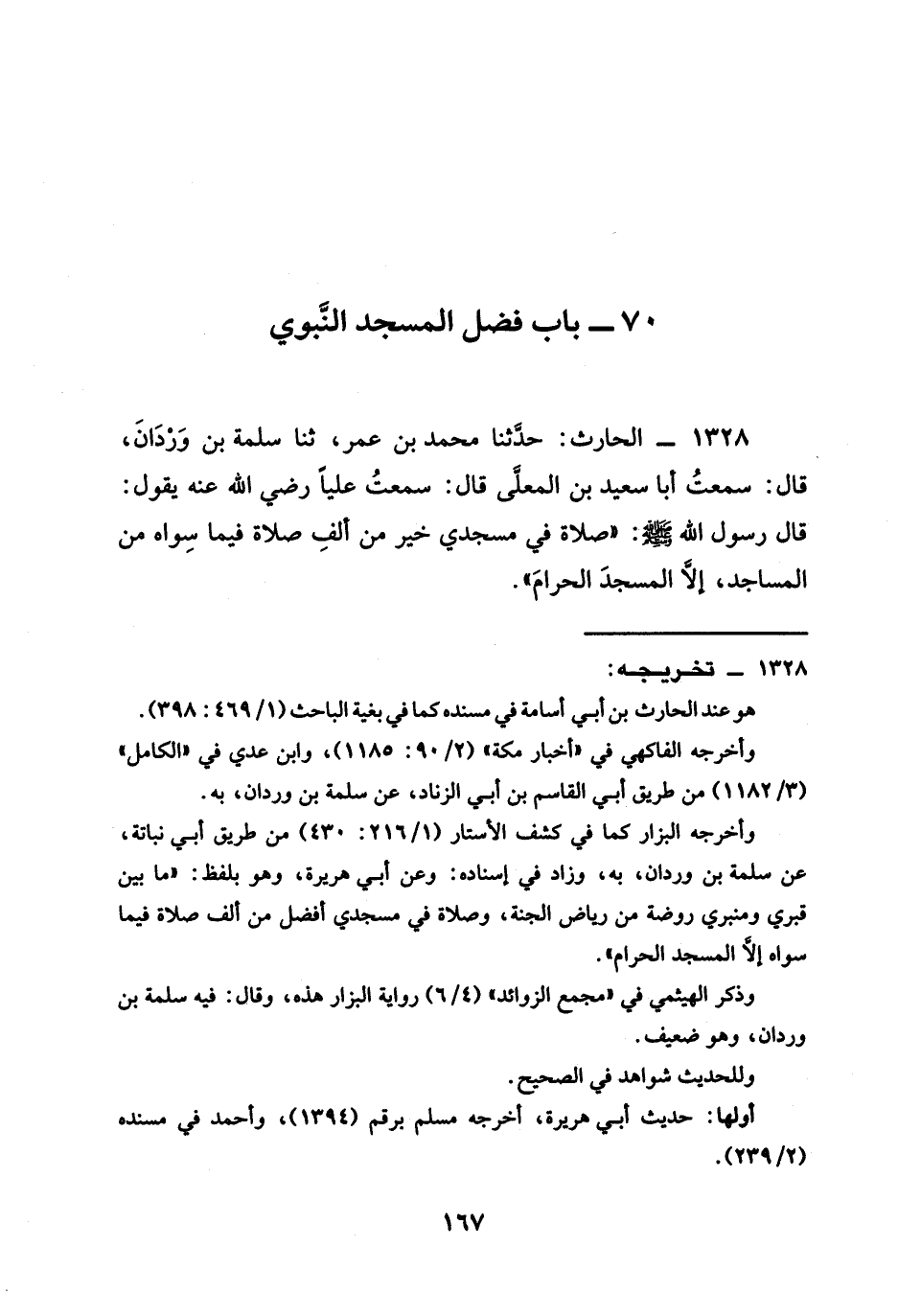 1328 - الْحَارِثُ حَدَّثَنَا مُحَمَّدُ بْنُ عُمَرَ ثنا سَلَمَةُ بْنُ وردان قال سَمِعْتُ أَبَا سَعِيدِ بْنَ المعلى قال سمعت عليا رَضِيَ الله عَنْه يَقُولُ قَالَ رَسُولُ اللَّهِ صَلَّى اللَّهُ عَلَيْهِ وَسَلَّمَ §صَلَاةٌ فِي مَسْجِدِي خَيْرٌ مِنْ أَلْفِ صَلَاةٍ فِيمَا سِوَاهُ مِنَ الْمَسَاجِدِ إِلَّا الْمَسْجِدَ الْحَرَامَ