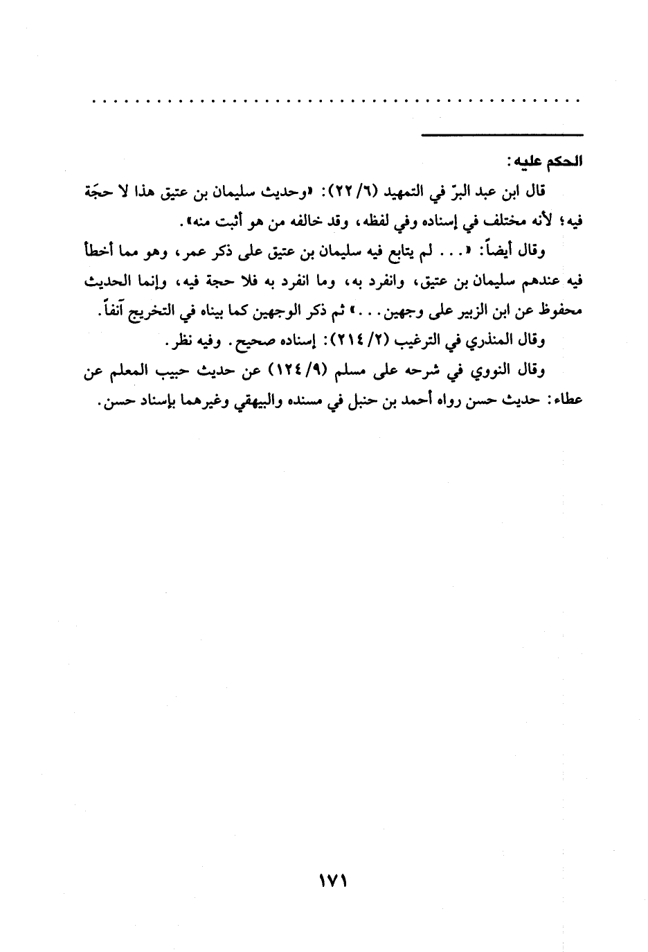 قال ابن عبد البرّ في التمهيد (6/ 22): "وحديث سليمان بن عتيق هذا لا حجَة فيه؛ لأنه مختلف في إسناده وفي لفظه، وقد خالفه من هو أثبت منه".