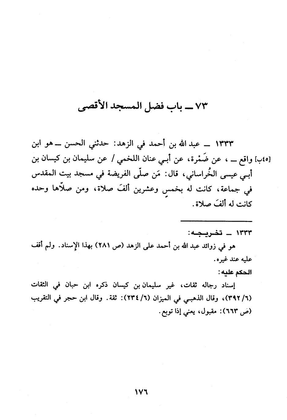 1333 - عَبْدُ اللَّهِ بْنُ أَحْمَدَ فِي الزُّهْدِ حدثني الْحَسَنُ هو ابن واقع عَنْ ضَمْرَةَ عَنْ أَبِي عَنَانٍ اللَّخْمِيِّ عَنْ سُلَيْمَانَ بن كيسان بْنِ أَبِي عِيسَى الْخُرَاسَانِيِّ قَالَ مَنْ صَلَّى الْفَرِيضَةَ فِي مَسْجِدِ بَيْتِ الْمَقْدِسِ فِي جَمَاعَةٍ كَانَتْ لَهُ بِخَمْسٍ وَعِشْرِينَ أَلْفَ صَلَاةٍ وَمَنْ صَلَّاهَا وَحْدَهُ كانت له ألف صَلَاةٍ