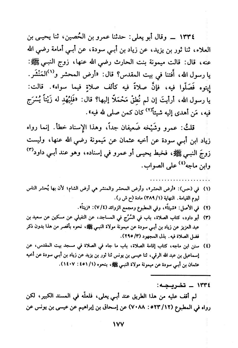 1334 - وَقَالَ أَبُو يَعْلَى حَدَّثَنَا عَمْرُو بْنُ الْحُصَيْنِ ثنا يَحْيَى بْنُ الْعَلَاءِ ثنا ثَوْرُ بْنُ يَزِيدَ عَنْ زِيَادِ بْنِ أَبِي سَوْدَةَ عَنْ أبي أمامة رَضِيَ الله عَنْه قَالَ قَالَتْ مَيْمُونَةُ بنت الحارث رَضِيَ الله عَنْها زَوْجُ النَّبِيِّ صَلَّى اللَّهُ عَلَيْهِ وَسَلَّمَ يَا رَسُولَ اللَّهِ أَفْتِنَا فِي بَيْتِ الْمَقْدِسِ قَالَ §أَرْضُ الْمَحْشَرِ وَالْمَنْشَرِ إيتوه فَصَلُّوا فِيهِ فَإِنَّ صَلَاةً فِيهِ كَأَلْفِ صَلَاةٍ فِيمَا سِوَاهُ قَالَتْ يَا رَسُولَ اللَّهِ أَرَأَيْتَ إِنْ لَمْ نطق محملا إليها قَالَ فَلْيُهْدِ لَهُ زَيْتًا يُسْرَجُ فِيهِ من أَهْدَى إِلَيْهِ شَيْئًا كَانَ كمن صلى لله فِيهِ قُلْتُ عَمْرٌو وَشَيْخُهُ ضَعِيفَانِ جِدًّا وَهَذَا الْإِسْنَادُ خَطَأٌ إِنَّمَا رَوَاهُ زِيَادُ ابن أَبِي سَوْدَةَ عَنْ أَخِيهِ عُثْمَانَ عن ميمونة رَضِيَ الله عَنْها وَلَيْسَتْ زَوْجَ النَّبِيِّ صَلَّى اللَّهُ عَلَيْهِ وَسَلَّمَ فَخَبَّطَ يَحْيَى أَوْ عَمْرٌو فِي إِسْنَادِهِ وَهُوَ عِنْدَ أَبِي دَاوُدَ وَابْنِ مَاجَةَ عَلَى الصَّوَابِ