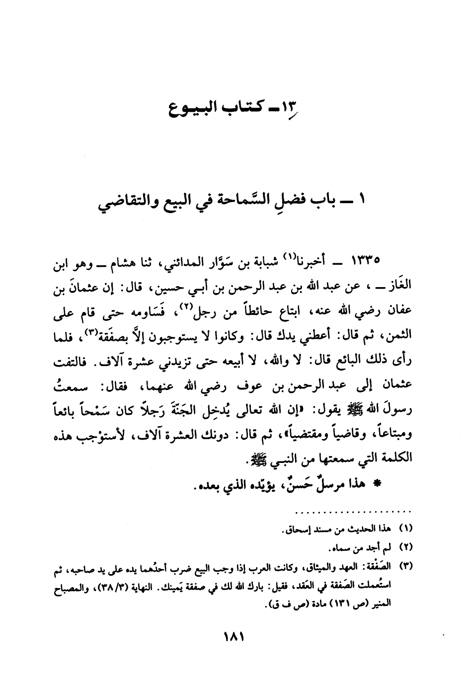1335 - أَخْبَرَنَا شَبَابَةُ بْنُ سَوَّارٍ الْمَدَائِنِيُّ ثنا هِشَامٌ وَهُوَ ابْنُ الْغَازِ عَنْ عَبْدِ اللَّهِ بْنِ عَبْدِ الرَّحْمَنِ بْنِ أبي حسين قال أَنَّ عُثْمَانَ بن عفان رَضِيَ الله عَنْه ابْتَاعَ حَائِطًا مِنْ رَجُلٍ فَسَاوَمَهُ حَتَّى قَامَ عَلَى الثَّمَنِ ثُمَّ قَالَ أَعْطِنِي يدك قال وَكَانُوا لَا يَسْتَوْجِبُونَ إِلَّا بِصْفَقَةٍ فلما رأى ذلك الْبَائِعَ قَالَ لَا وَاللَّهِ لَا أَبِيعُهُ حَتَّى تَزِيدَنِي عَشْرَةَ آلَافٍ فَالْتَفَتَ عُثْمَانُ إِلَى عَبْدِ الرَّحْمَنِ بن عوف رَضِيَ الله عَنْهما فَقَالَ سَمِعْتُ رَسُولَ اللَّهِ صَلَّى اللَّهُ عَلَيْهِ وَسَلَّمَ يَقُولُ §إِنَّ اللَّهَ تَعَالَى يُدْخِلُ الْجَنَّةَ رَجُلًا كَانَ سَمْحًا بَائِعًا وَمُبْتَاعًا وَقَاضِيًا وَمُقْتَضِيًا ثُمَّ قَالَ دُونَكَ الْعَشَرَةُ آلَافِ لِأَسْتَوْجِبَ هَذِهِ الْكَلِمَةَ الَّتِي سَمِعْتُهَا مِنْ النَّبِيِّ صَلَّى اللَّهُ عَلَيْهِ وَسَلَّمَ