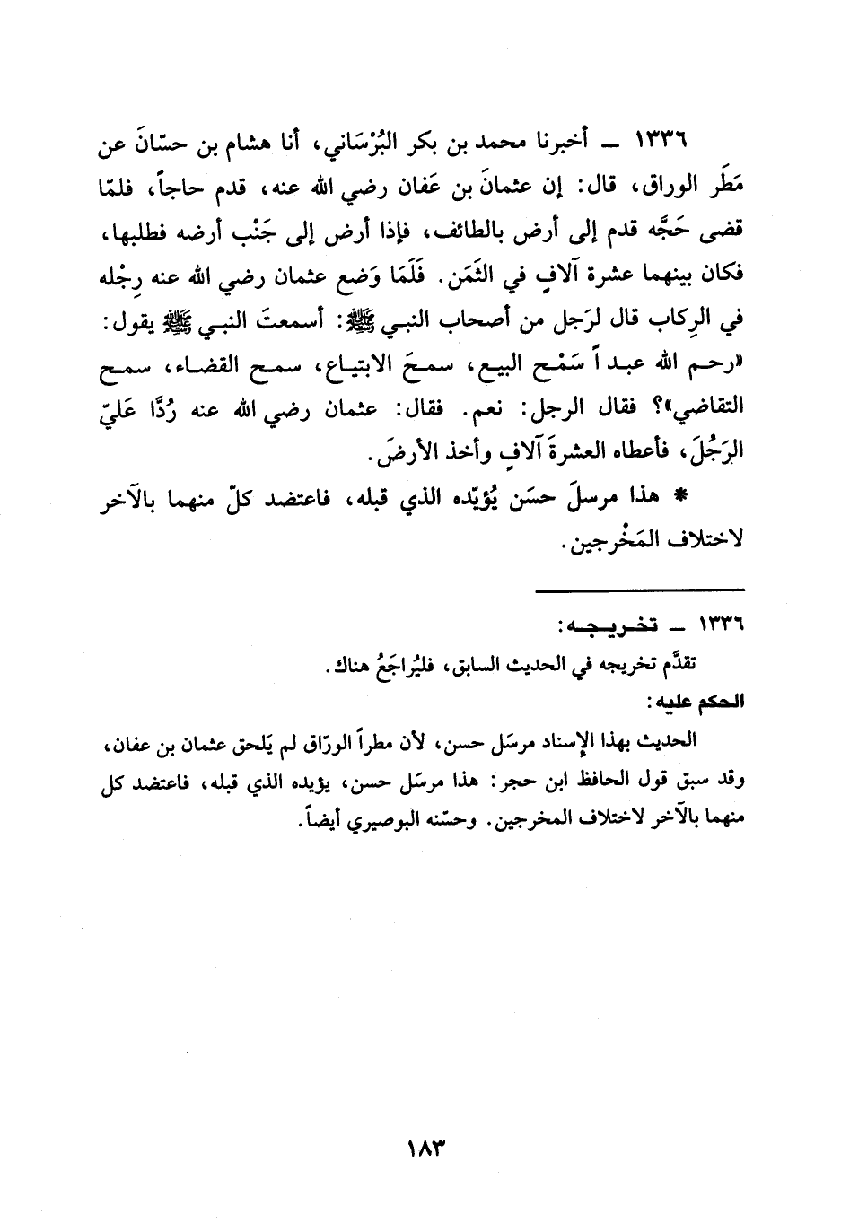 1336 - أَخْبَرَنَا مُحَمَّدُ بْنُ بَكْرٍ الْبُرْسَانِيُّ أنا هِشَامُ بْنُ حَسَّانَ عَنْ مطر الوراق قال أَنَّ عُثْمَانَ بن عفان رَضِيَ الله عَنْه قَدِمَ حَاجًّا فَلَمَّا قَضَى حَجَّهُ قَدِمَ إِلَى أَرْضٍ بِالطَّائِفِ فَإِذَا أَرْضٌ إِلَى جَنْبِ أَرْضِهِ فَطَلَبَهَا فَكَانَ بَيْنَهُمَا عَشْرَةُ آلَافٍ فِي الثَّمَنِ فَلَمَّا وضع عثمان رَضِيَ الله عَنْه رِجْلَهُ فِي الرِّكَابِ قَالَ لِرَجُلٍ مِنْ أَصْحَابِ النَّبِيِّ صَلَّى اللَّهُ عَلَيْهِ وَسَلَّمَ أَسَمِعْتَ النَّبِيَّ صَلَّى اللَّهُ عَلَيْهِ وَسَلَّمَ يَقُولُ §رَحِمَ اللَّهُ عَبْدًا سَمْحَ الْبَيْعِ سَمْحَ الِابْتِيَاعِ سَمْحَ الْقَضَاءِ سَمْحَ التَّقَاضِي فَقَالَ الرَّجُلُ نَعَمْ فقال عثمان رَضِيَ الله عَنْه رَدًّا الرَّجُلَ فأعطاه العشرة آلف وَأَخَذَ الْأَرْضَ