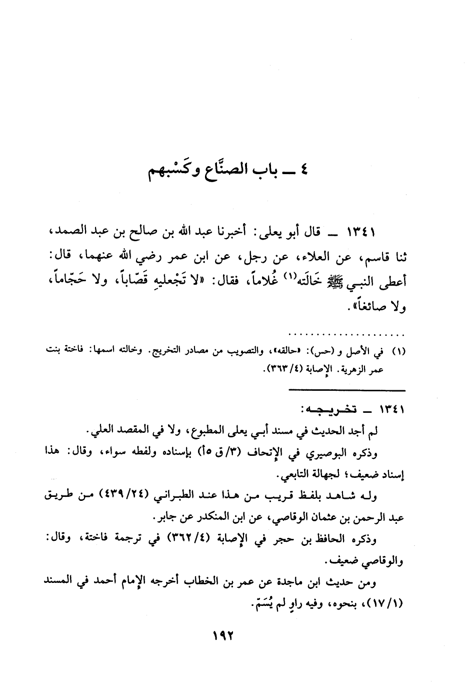 1341 - قَالَ أَبُو يَعْلَى أَخْبَرَنَا عَبْدُ اللَّهِ بْنُ صَالِحِ بْنِ عَبْدِ الصَّمَدِ ثنا قَاسِمٌ عَنِ الْعَلَاءِ عَنْ رَجُلٍ عَنِ ابن عمر رَضِيَ الله عَنْهما قَالَ أَعْطَى النَّبِيُّ صَلَّى اللَّهُ عَلَيْهِ وَسَلَّمَ خَالَتَهُ غُلَامًا فَقَالَ §لَا تَجْعَلِيهِ قَصَّابًا وَلَا حَجَّامًا وَلَا صَائِغًا
