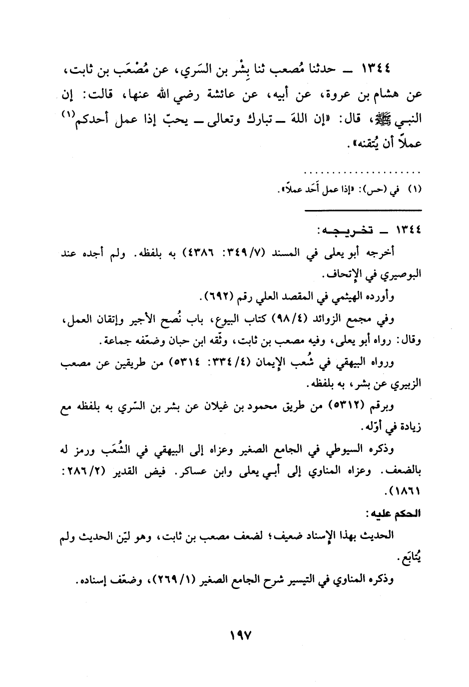 1344 - حَدَّثَنَا مُصْعَبٌ ثنا بِشْرُ بْنُ السَّرِيِّ عَنْ مُصْعَبِ بْنِ ثَابِتٍ عَنْ هِشَامِ بْنِ عُرْوَةَ عَنْ أَبِيهِ عن عائشة رَضِيَ الله عَنْها قالت أَنَّ النَّبِيَّ صَلَّى اللَّهُ عَلَيْهِ وَسَلَّمَ قَالَ §إن الله تبارك وتعالى يُحِبُّ إِذَا عَمِلَ أَحَدُكُمْ عَمَلًا أَنْ يُتْقِنَهُ