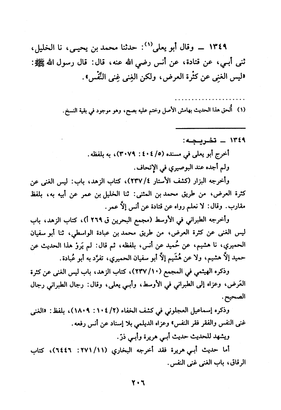 1349 - وَقَالَ أَبُو يَعْلَى حَدَّثَنَا مُحَمَّدُ بن يحيى نا الخليل ثنى أَبِي عَنْ قَتَادَةَ عن أنس رَضِيَ الله عَنْه قَالَ قَالَ رَسُولُ اللَّهِ صَلَّى اللَّهُ عَلَيْهِ وَسَلَّمَ §لَيْسَ الْغِنَى عَنْ كَثْرَةِ الْعَرَضِ ولكن الغنى عن غِنَى النَّفْسِ
