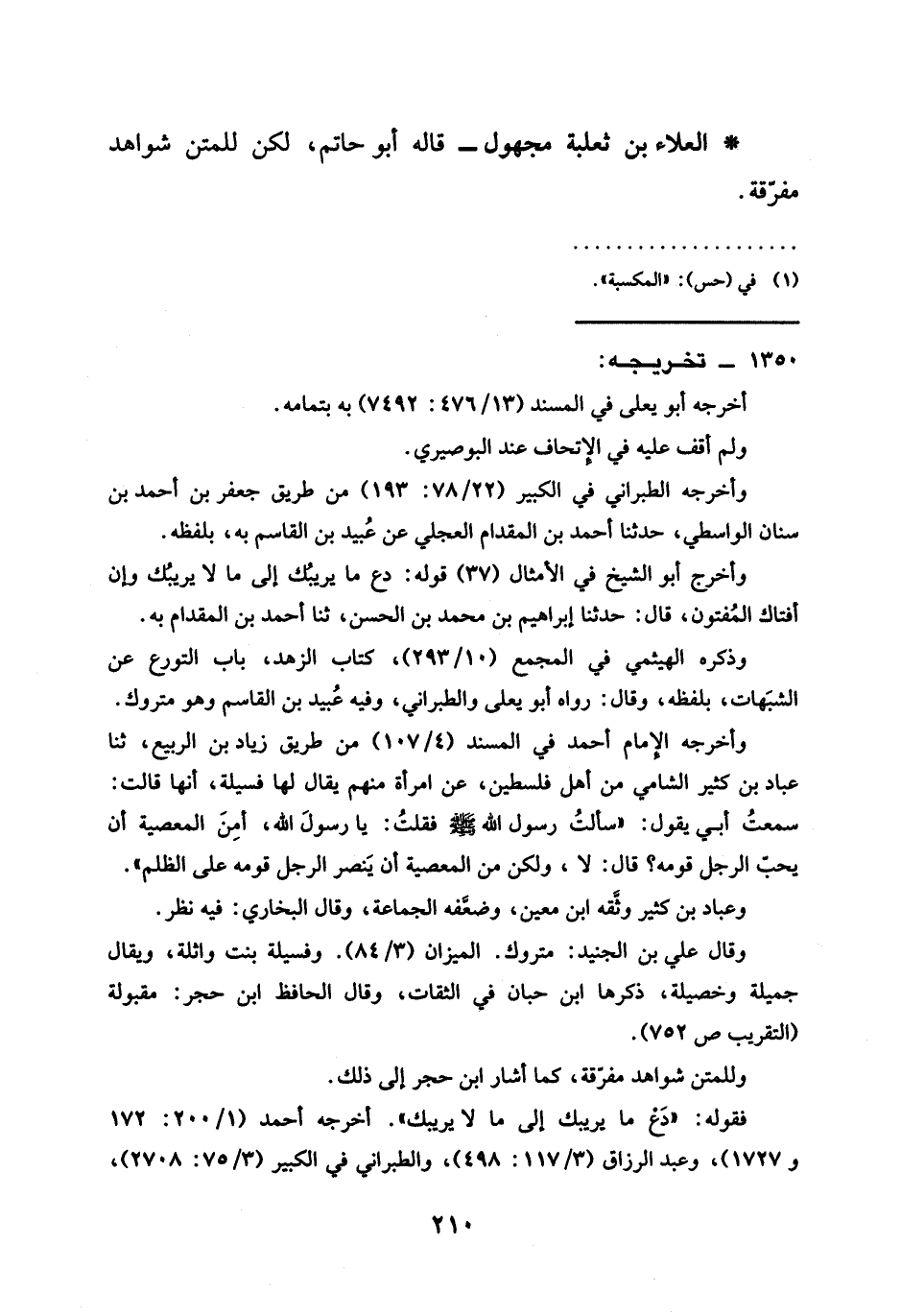 وأخرج أبو الشيخ في الأمثال (37) قوله: دَعْ مَا يريبُك إِلَى مَا لَا يَرِيبُكَ وإن أفتاك المُفتون، قال: حدثنا إبراهيم بن محمد بن الحسن، ثنا أحمد بن المقدام به.