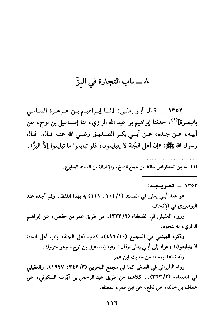 1352 - قَالَ أَبُو يَعْلَى ثنا إبراهيم بن عرعرة السامي بالبصرة حدثنا إبراهيم بْنُ عَبْدِ اللَّهِ الرَّازِيُّ ثنا إِسْمَاعِيلُ بْنُ نُوحٍ عَنْ أَبِيهِ عَنْ جَدِّهِ عَنْ أَبِي بكر الصديق رَضِيَ الله عَنْه قَالَ قَالَ رَسُولُ اللَّهِ صَلَّى اللَّهُ عَلَيْهِ وَسَلَّمَ إِنَّ §أَهْلَ الْجَنَّةِ لَا يتابعون فلو تبايعوا إلى الْبَزَّ
