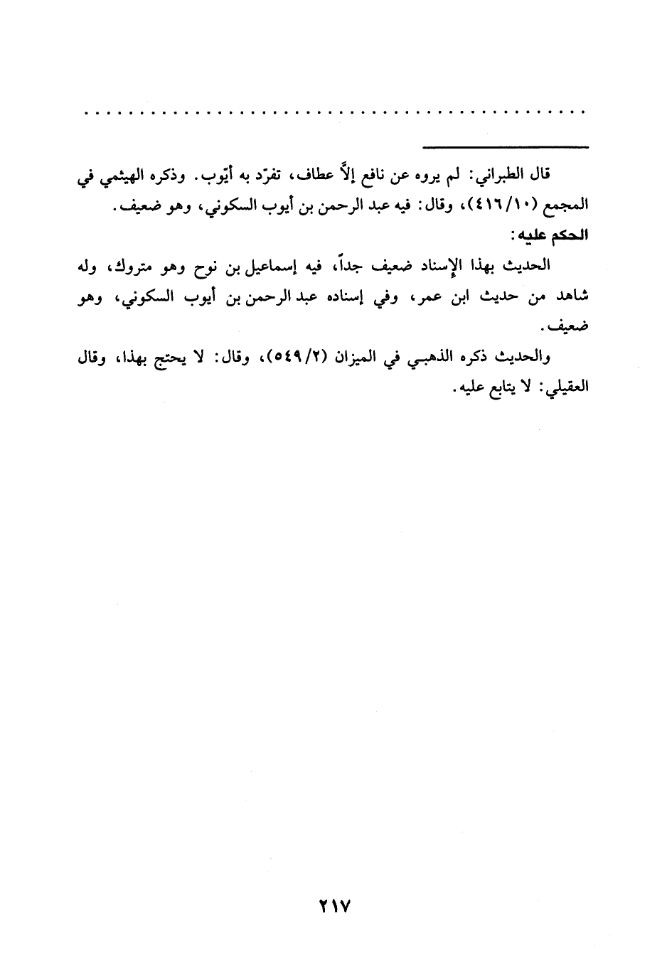= قال الطبراني: لم يروه عن نافع إلَّا عطاف، تفرّد به أيّوب. وذكره الهيثمي في المجمع (10/ 416)، وقال: فيه عبد الرحمن بن أيوب السكوني، وهو ضعيف.
