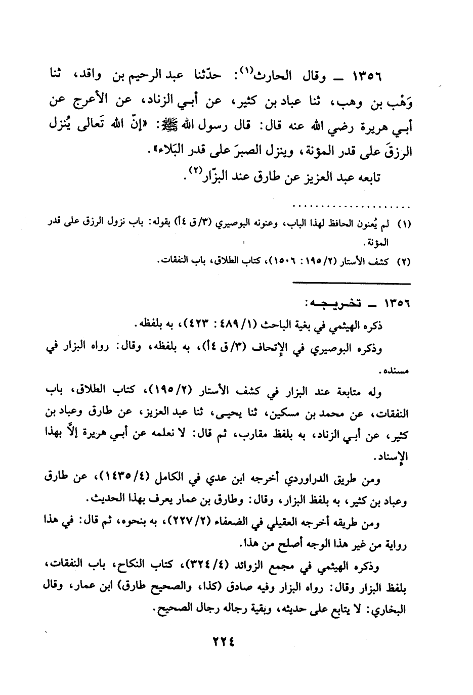 1356 - وقال الحارث حدثنا عبد الرحيم بن واقد ثنا وهب بن وهب ثنا عباد بن كثير عن أبي الزناد عن الأعرج عن أبي هريرة رَضِيَ الله عَنْه قال قال رسول الله صَلَّى اللَّهُ عَلَيْهِ وَسَلَّمَ إن الله تعالى ينزل الرزق على قدر المؤنة وينزل الصبر على قدر البلاء تابعه عبد العزيز عن طارق بن البزار