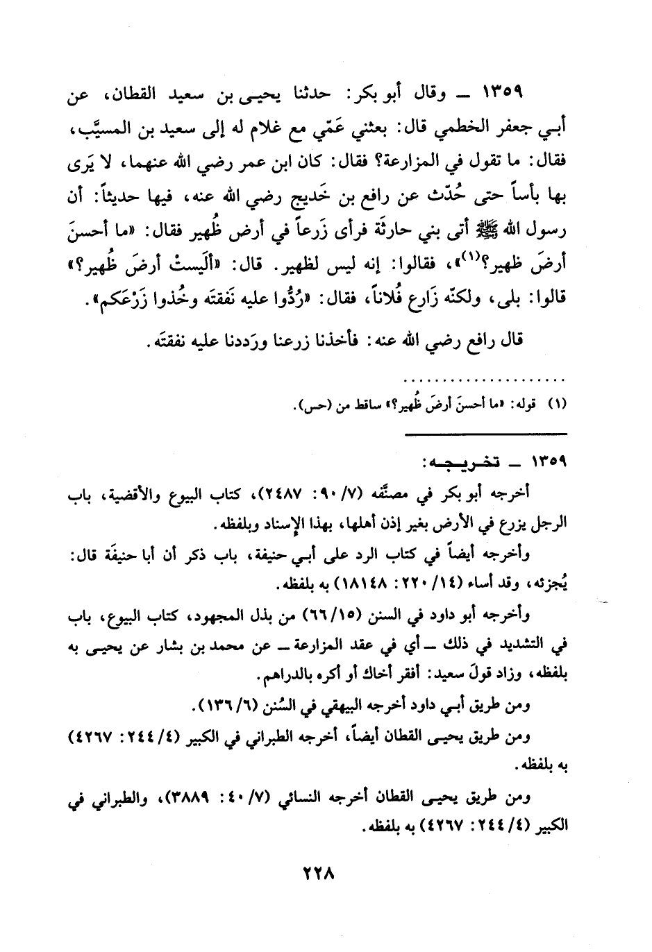 1359 - وَقَالَ أَبُو بَكْرِ حَدَّثَنَا يَحْيَى بْنُ سَعِيدٍ الْقَطَّانُ عَنْ أَبِي جَعْفَرٍ الْخَطْمِيِّ قَالَ بَعَثَنِي عَمِّي مَعَ غُلَامٍ لَهُ إِلَى سَعِيدِ بْنِ الْمُسَيِّبِ فَقَالَ مَا تَقُولُ فِي الْمُزَارَعَةِ فَقَالَ كَانَ ابْنُ عُمَرَ، رَضِيَ الله عَنْهما لَا يَرَى بِهَا بَأْسًا، حَتَّى حُدِّثَ، عَنْ رَافِعِ بْنِ خَدِيجٍ رَضِيَ الله عَنْه، فِيهَا حَدِيثًا أَنَّ رَسُولَ اللَّهِ صَلَّى اللَّهُ عَلَيْهِ وَسَلَّمَ أَتَى بَنِي حَارِثَةَ فَرَأَى زَرْعًا فِي أَرْضِ ظُهَيْرٍ فَقَالَ §مَا أحسن أرض ظهيرا فقالوا إِنَّهُ لَيْسَ لِظُهَيْرٍ قَالَ أليست أرض ظهيرا قَالُوا بَلَى وَلَكِنَّهُ زارع فلانا فقال ردوا عَلَيْهِ نَفَقَتَهُ وَخُذُوا زَرْعَكُمْ قال رافع رَضِيَ الله عَنْه فَأَخَذْنَا زَرْعَنَا وَرَدَدْنَا عَلَيْهِ نَفَقَتَهُ