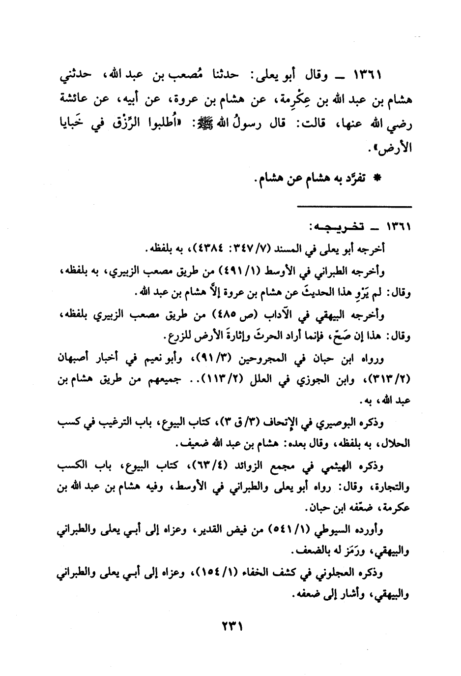 1361 - وَقَالَ أَبُو يَعْلَى حَدَّثَنَا مُصْعَبُ بْنُ عَبْدِ اللَّهِ حَدَّثَنِي هِشَامُ بْنُ عَبْدِ اللَّهِ بْنِ عِكْرِمَةَ عَنْ هِشَامِ بْنِ عُرْوَةَ عَنْ أَبِيهِ عن عائشة رَضِيَ الله عَنْها قَالَتْ قَالَ رَسُولُ اللَّهِ صَلَّى اللَّهُ عَلَيْهِ وَسَلَّمَ §اطْلُبُوا الرِّزْقَ فِي خَبَايَا الْأَرْضِ