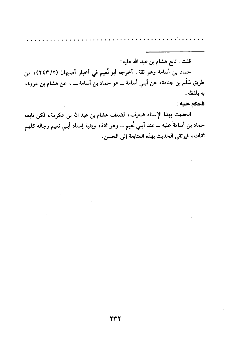 حماد بن أسامة وهو ثقة. أخرجه أبو نُعيم في أخبار أصبهان (2/ 243)، من طريق سلم بن جنادة، عن أبي أسامة -هو حماد بن أسامة-، عن هشام بن عروة، به بلفظه.