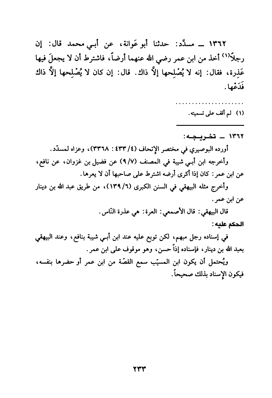 1362 - مُسَدَّدٌ حَدَّثَنَا أَبُو عَوَانَةَ عَنْ أبي محمد قال أَنَّ رَجُلًا أَخَذَ مِنَ ابن عمر رَضِيَ الله عَنْهما أَرْضًا فَاشْتَرَطَ أَنْ لَا يَجْعَلَ فِيهَا عُذْرَةً فَقَالَ إِنَّهُ لَا يصلحها إلا ذاك قال §إن كَانَ لَا يُصْلِحُهَا إِلَّا ذَاكَ فَدَعْهَا