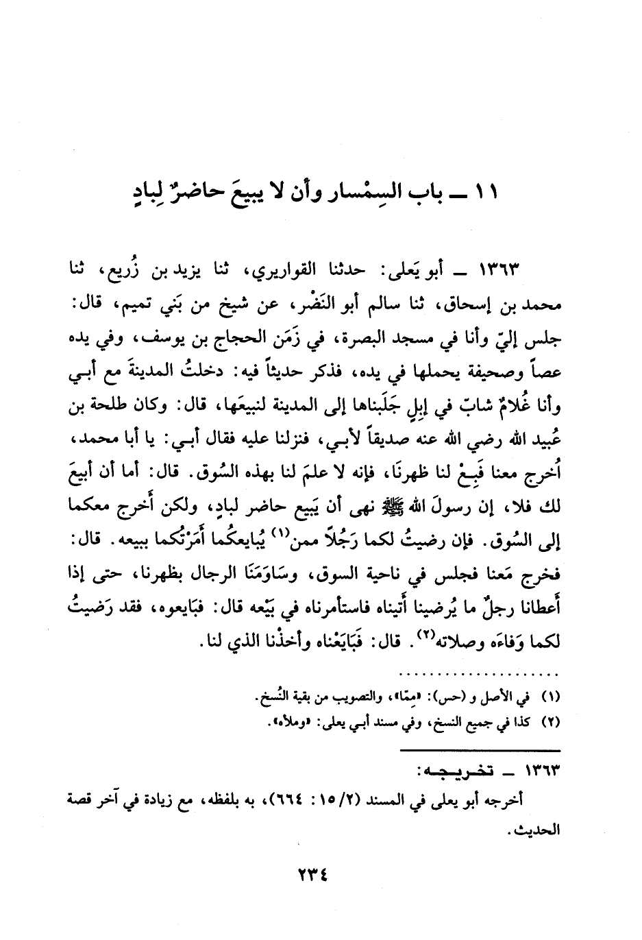 1363 - أَبُو يَعْلَى حَدَّثَنَا الْقَوَارِيرِيُّ ثنا يَزِيدُ بْنُ زُرَيْعٍ ثنا مُحَمَّدُ بْنُ إِسْحَاقَ ثنا سَالِمٌ أَبُو النَّضْرِ عَنْ شَيْخٍ مِنْ بَنِي تَمِيمٍ قَالَ جَلَسَ إِلَيَّ وَأَنَا فِي مَسْجِدِ الْبَصْرَةِ فِي زَمَنِ الْحَجَّاجِ بْنِ يُوسُفَ وَفِي يَدِهِ عَصًا وَصَحِيفَةٌ يَحْمِلُهَا فِي يَدِهِ فَذَكَرَ حَدِيثًا فِيهِ دَخَلْتُ الْمَدِينَةَ مَعَ أَبِي وَأَنَا غُلَامٌ شَابٌّ فِي إِبِلٍ جَلَبْنَاهَا إِلَى الْمَدِينَةِ لِنَبِيعَهَا قَالَ وَكَانَ طَلْحَةُ بْنُ عبيد الله رَضِيَ الله عَنْه صَدِيقًا لِأَبِي فَنَزَلْنَا عَلَيْهِ فَقَالَ أَبِي يَا أَبَا مُحَمَّدٍ اخْرُجْ مَعَنَا فَبِعْ لَنَا ظَهْرَنَا فَإِنَّهُ لَا عِلْمَ لَنَا بِهَذِهِ السُّوقِ قَالَ أَمَّا أَنْ أَبِيعَ لَكَ فَلَا إِنَّ رَسُولَ اللَّهِ صَلَّى اللَّهُ عَلَيْهِ وَسَلَّمَ §نَهَى أَنْ يَبِيعَ حَاضِرٌ لباد ولكن أخرج مَعَكُمَا إِلَى السُّوقِ فَإِنْ رَضِيتُ لَكُمَا رَجُلًا مِمَّنْ يُبَايِعُكُمَا أَمَرْتُكُمَا بِبَيْعِهِ قَالَ فَخَرَجَ مَعَنَا فَجَلَسَ فِي نَاحِيَةِ السُّوقِ وَسَاوَمَنَا الرِّجَالُ بِظَهْرِنَا حَتَّى إِذَا أَعْطَانَا رَجُلٌ مَا يُرْضِينَا أَتَيْنَاهُ فَاسْتَأْمَرْنَاهُ فِي بَيْعِهِ قَالَ فَبَايِعُوهُ فَقَدْ رَضِيتُ لَكُمَا وَفَاءَهُ وصلاته قَالَ فَبَايَعْنَاهُ وَأَخَذْنَا الَّذِي لَنَا